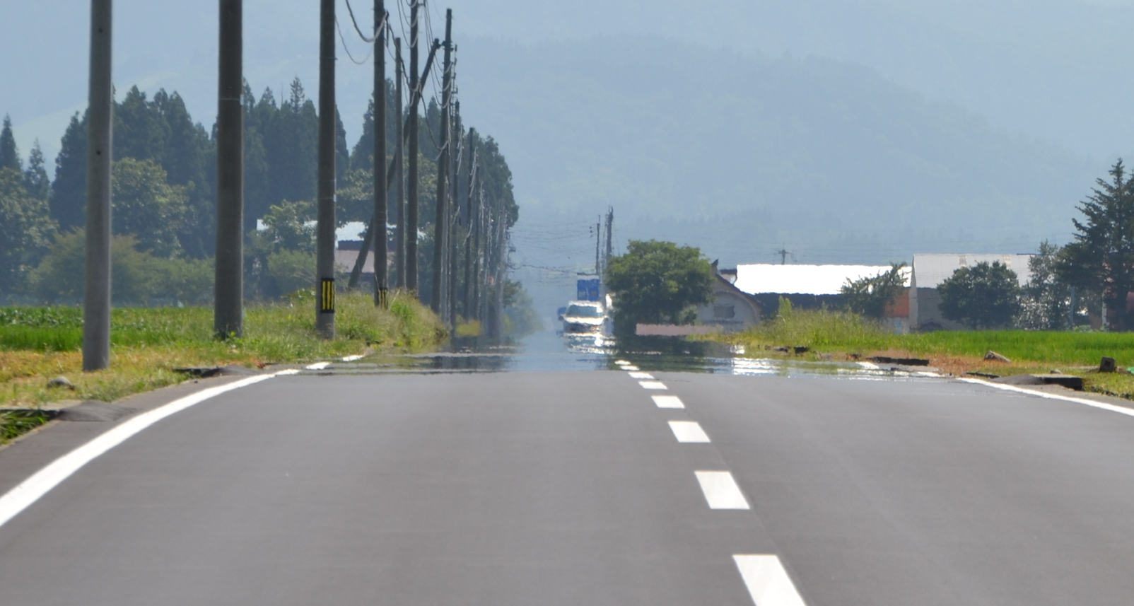 "Inferior mirage or road mirage observed in Tsunan, Niigata, Japan"