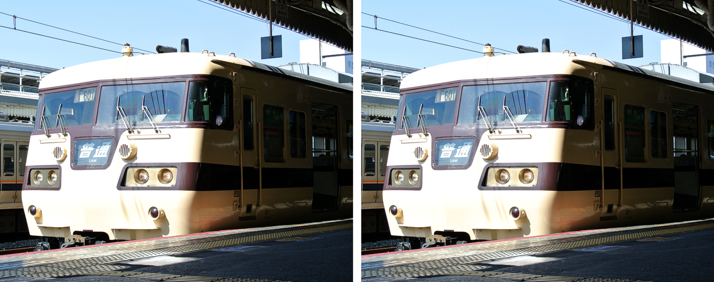 These two photos are identical, but the 'face' of the left train appears to be larger in size than that of the right one. I imagine this phenomenon is related to the leaning tower illusion.