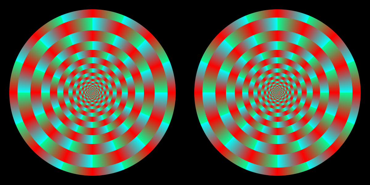 When observers approach or move away from this image keeping their eyes fixed on the center, the rings appear to rotate in the direction opposite to each other.