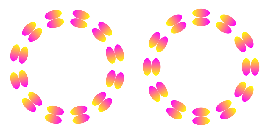 The left ring appears to rotate counterclockwise, the right one clockwise.
