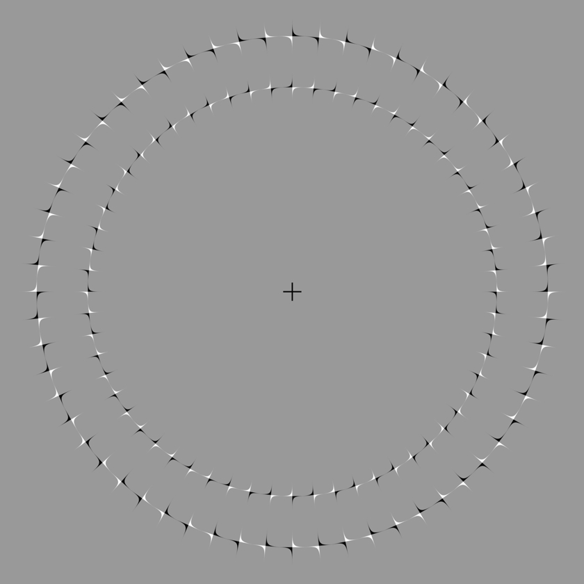 Two rings appear to rotate in different directions when observers approach or move away from this figure while fixating at the center.