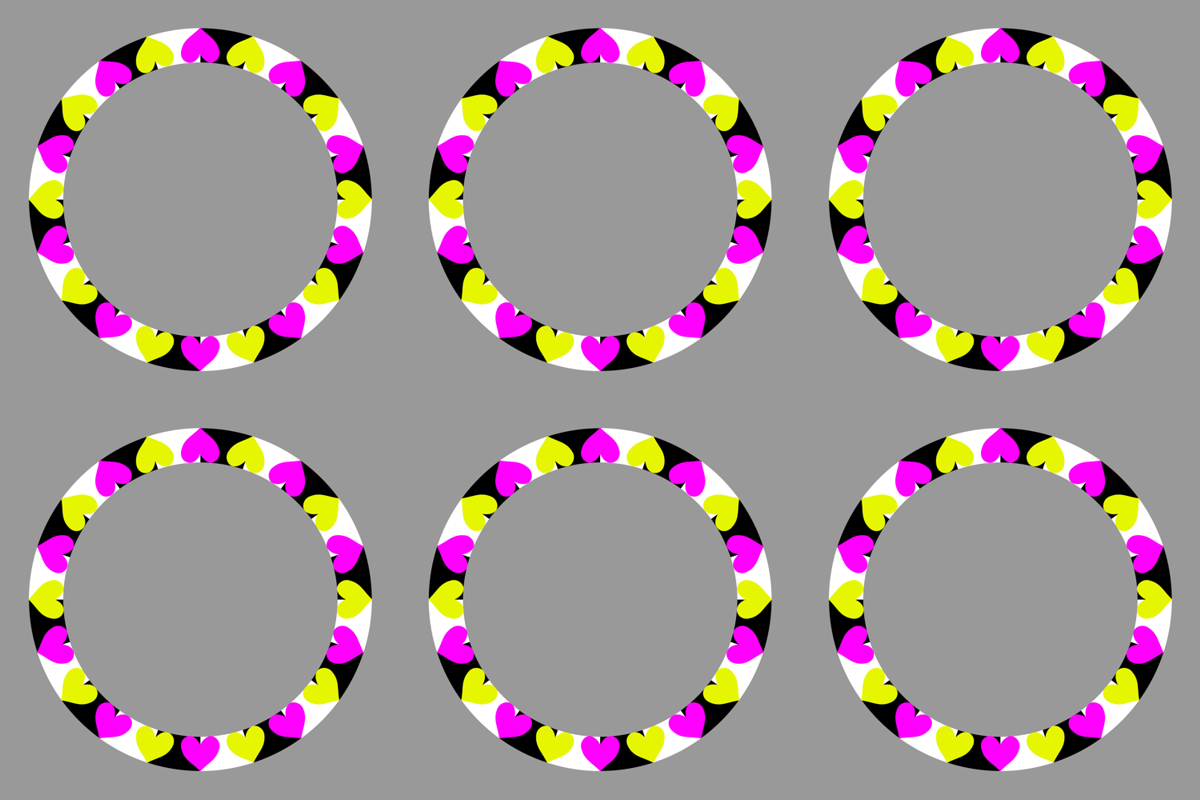 The inner ring appears to rotate counterclockwise and the outer ring clockwise when observers approach the image fixating at the center. On the other hand, the inner ring appears to rotate clockwise and the outer ring counterclockwise when observers move away from the image fixating at the center.