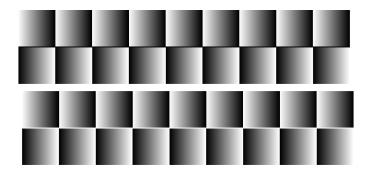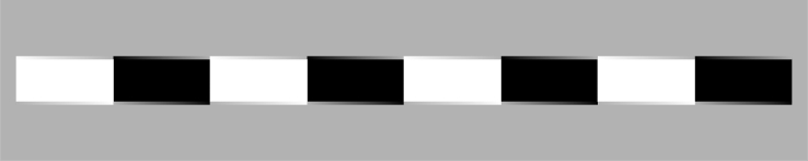 Illusion of smoothly shifted edges. The horizontal row of white and black rectangles appears to tilt clockwise.
