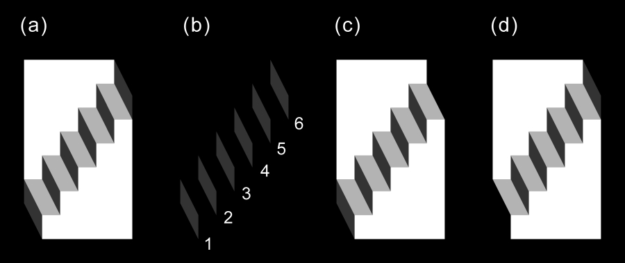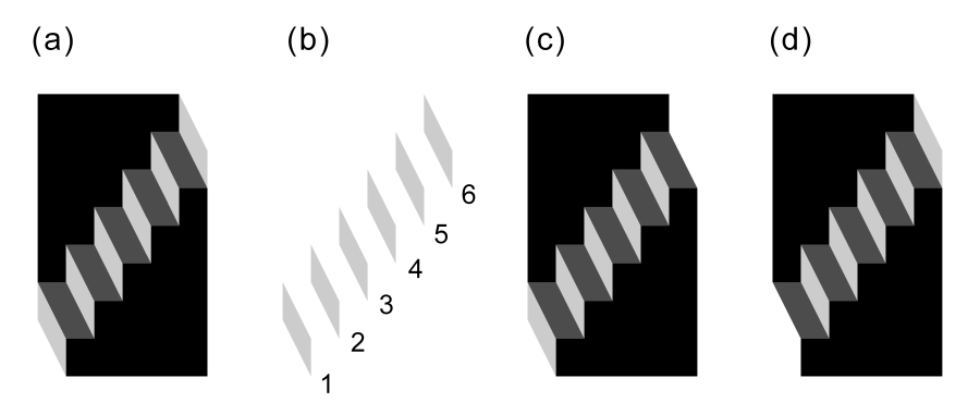 The Schröder's staircase is one of the famous, classic reversible figures. The original figure is a line drawing image, as shown below. I have reproduced this staircase as a painting image, as shown in Panel (a). The appearance is sometimes flipped over between Panel (c) (the lower-right black part appears to be in front) and Panel (d) (the upper-left black part appears to be in front). There are six light-gray parallelogram and five dark-gray ones. Among the light-gray parallelograms, the sizes are the same as each other (Panel (b)). Yet, parallelograms 1 and 6 appear to be smaller than the rest. The degree of the illusory shrinkage depends on the appearance of the staircase. Parallelograms 1 appears to be smaller than parallelogram 6 when the appearance is like Panel (d), while Parallelograms 6 appears to be smaller than parallelogram 1 when the appearance is like Panel (c).