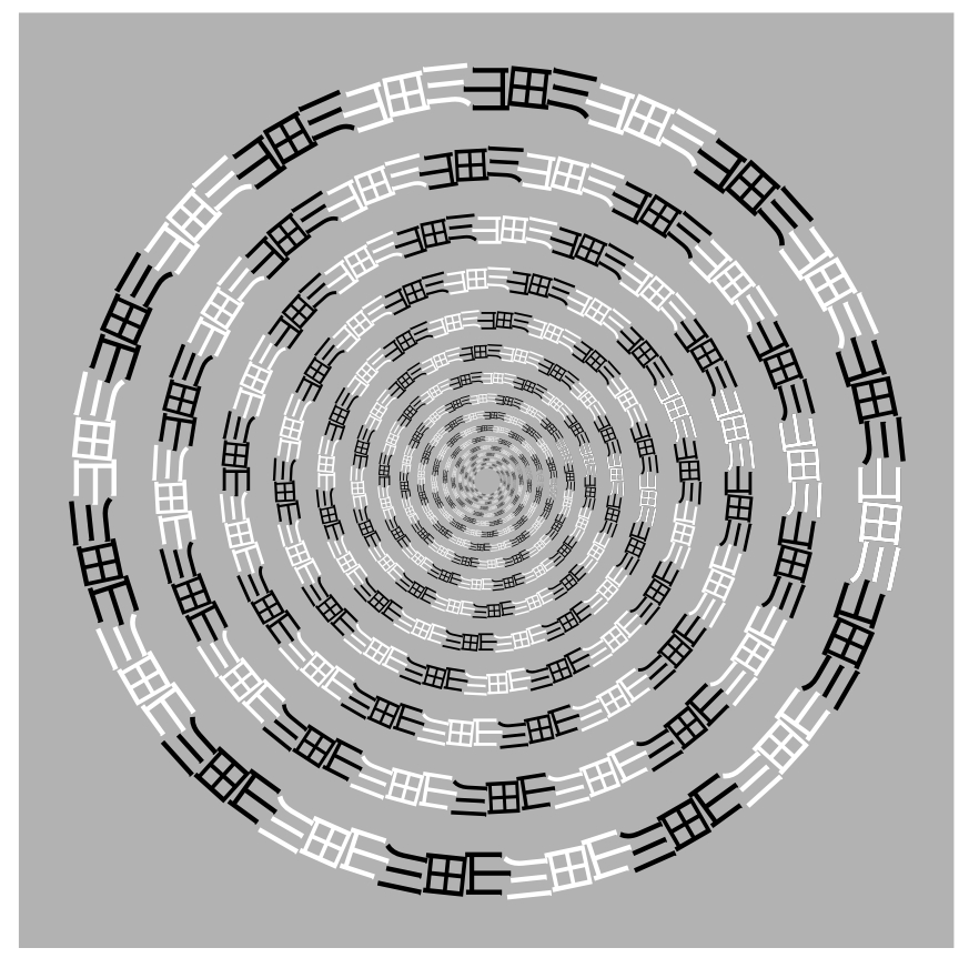 Concentric circles of a Chinese character and Katakana letters "Anzumanaa" gives a spiral appearance. This idea was first proposed by Dr. Makoto Ichikawa, Chiba University, Chiba, Japan.