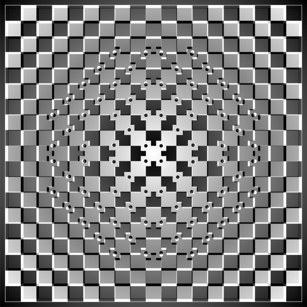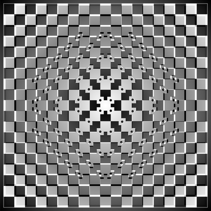 Something appears to be launched. This image include two illusions. One is an anomalous motion illusion in the radial directions (expansion/contraction); the other is a geometrical illusion that the vertically or horizontally aligned edges appear to tilt and the image appears to bulge out.