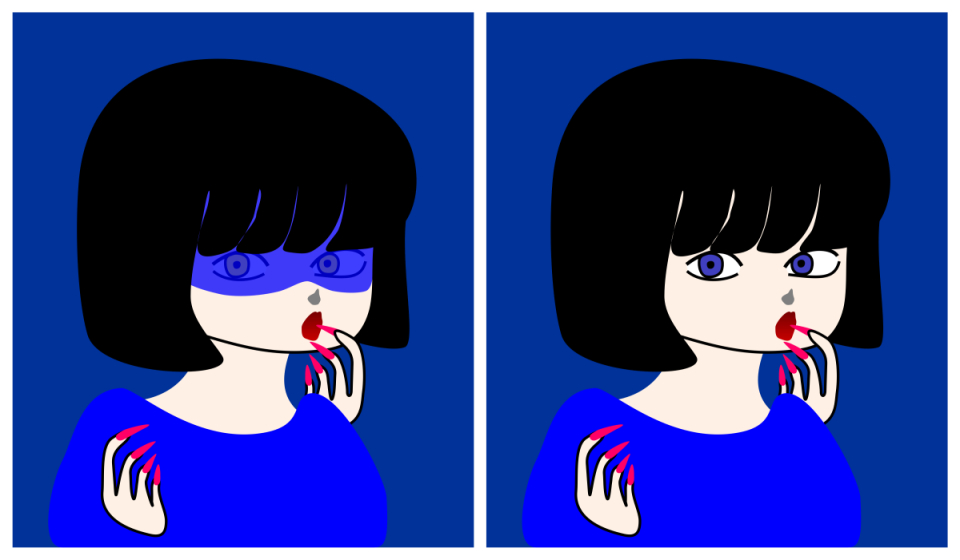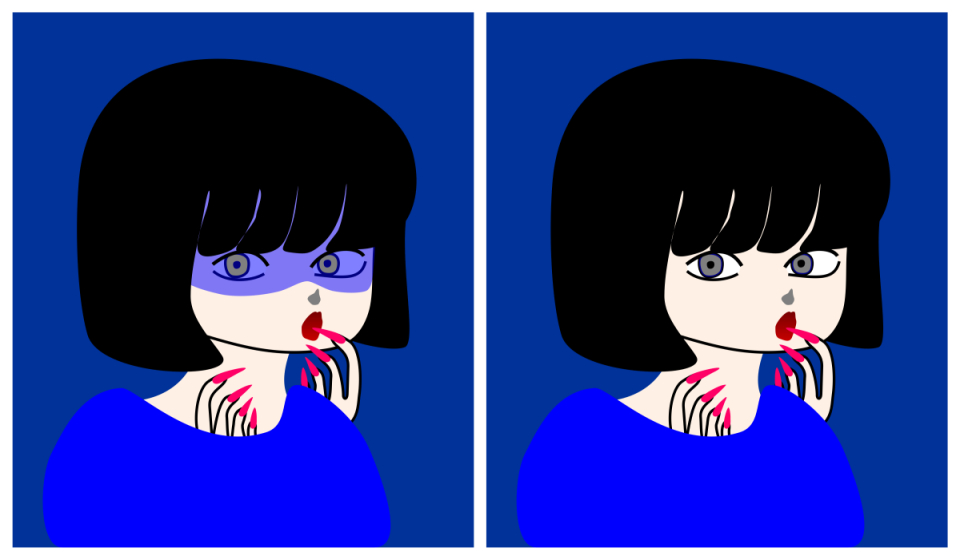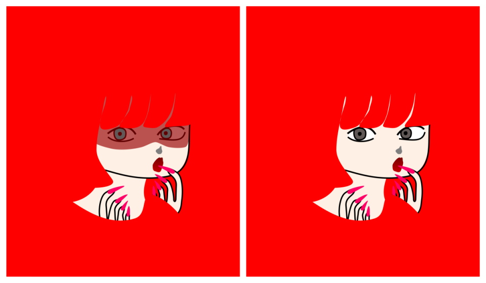 The eyes in the left image appears to be yellow while those in the right one appears to be blue, though they are the same color.
