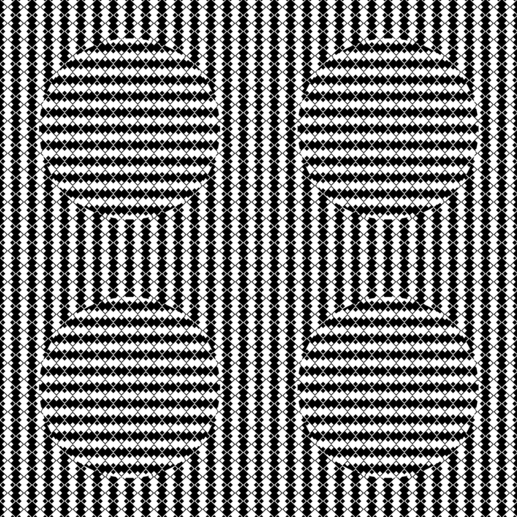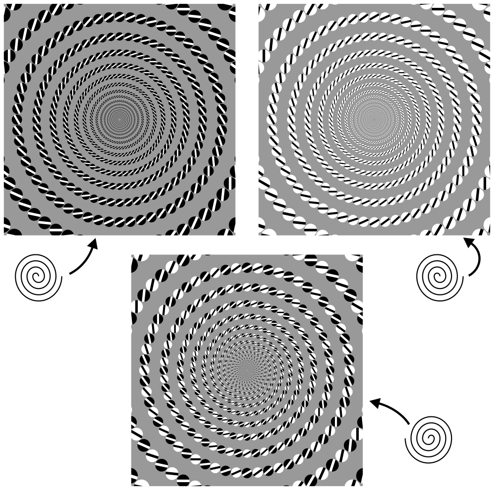 In each image, concentric circles appear to be spirals (a spiral). There is a difference in the direction of spiral. The upper two images show spirals that approach the center by rotating clockwise (the spiral illusion of the Zöllner illusion), while the lower one display spirals that approach the center by rotating counterclockwise (the spiral illusion of the Fraser illusion). All images are made of oblique segments of the same orientation when seen from the center.