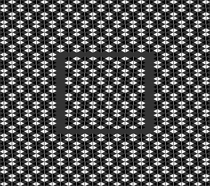 Vertically aligned line segments appear to tilt clockwise in the inset while counterclockwise in the surround (illusion of shifted lines). In addition, the inset appears to move horizontally when the image is moved vertically.