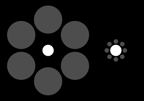 The right black disk appears to be larger than the left one, though they are the same size (Ebbinghaus size illusion). Moreover, the right group of gray disks appears to be lighter than the left one, though they are the same luminance.