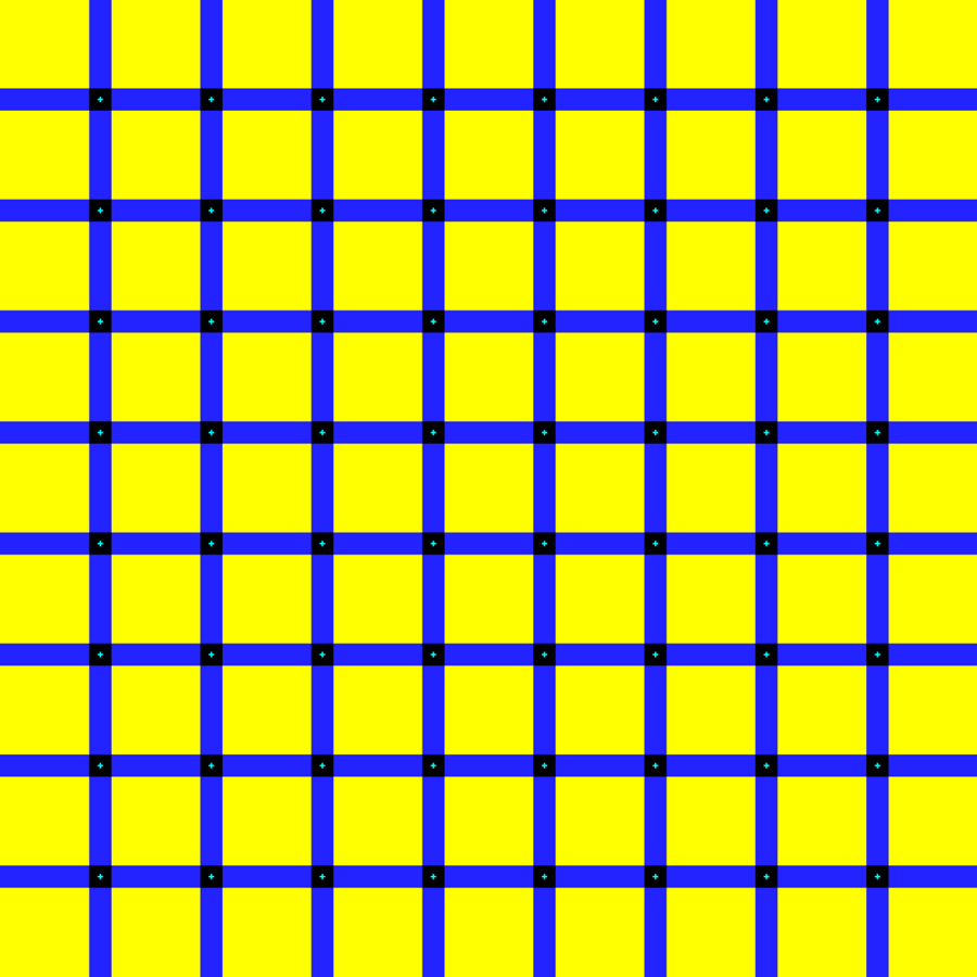 Crosses appear to be green (as they are (= cyan)) when seen in the central vision. The others appear to be yellowish or reddish.