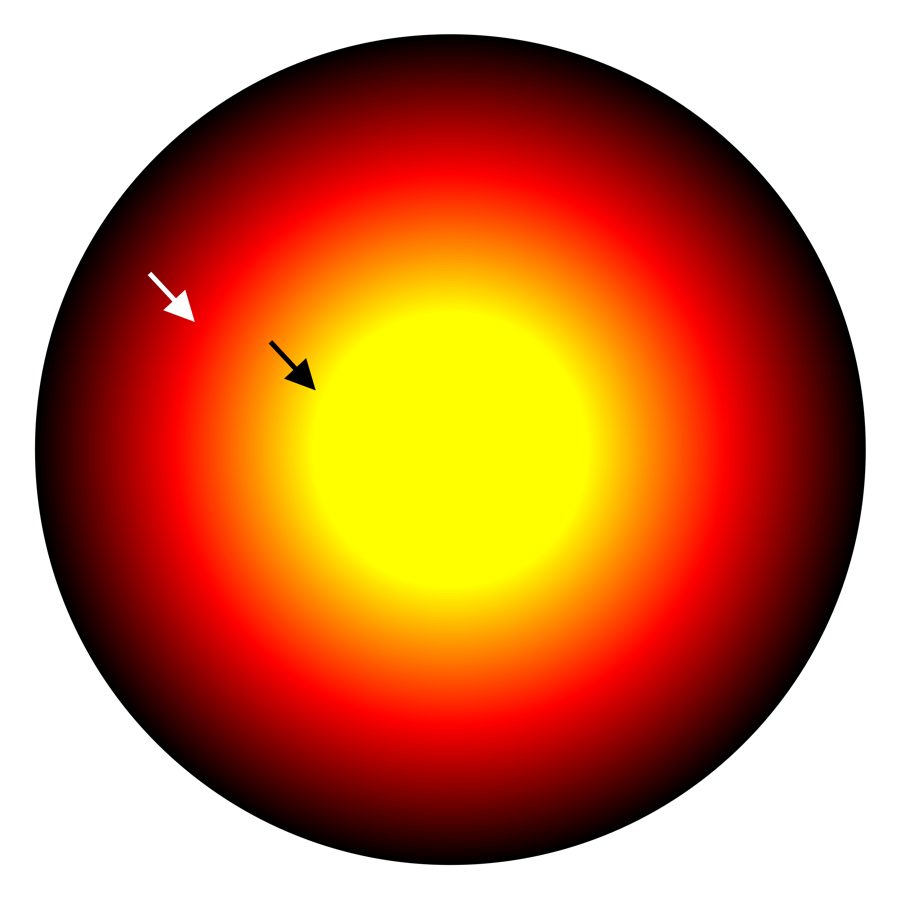 There appear to be an illusory red or yellow rings (chromatic Mach bands). There are physically a black-to-red gradation, a red-to-yellow gradation and a yellow disk.