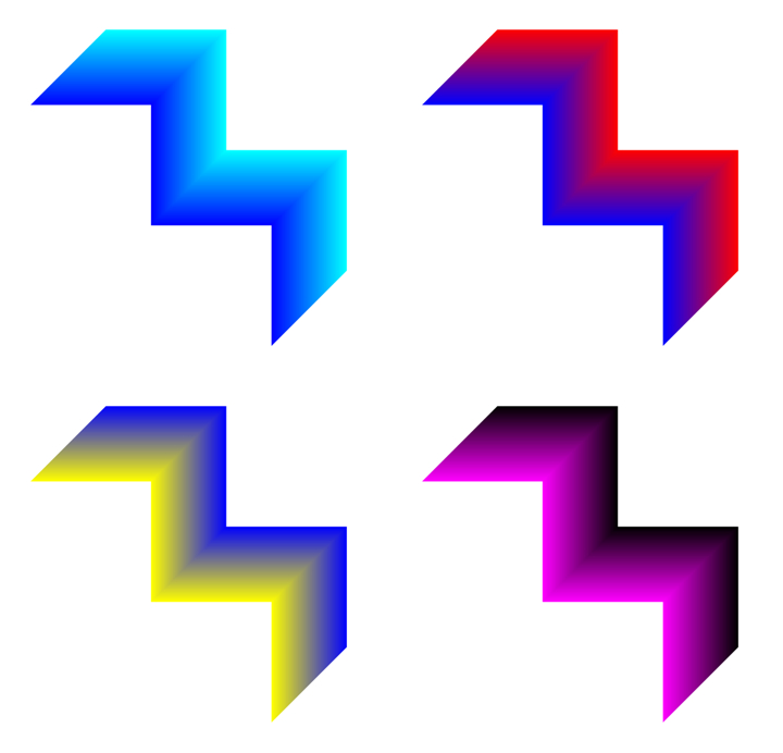 There appear to be staircases seen from above or bats seen from below (Schröder staircase). In each image, there are illusory lines of the chromatic Vasarely illusion. For example, for the upper-right image, illusory blue, red, and blue line segments are observed along folds.