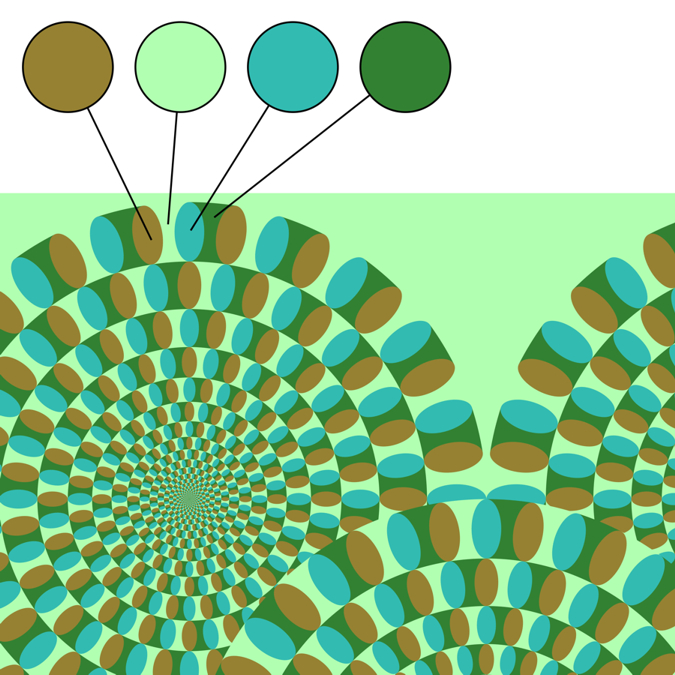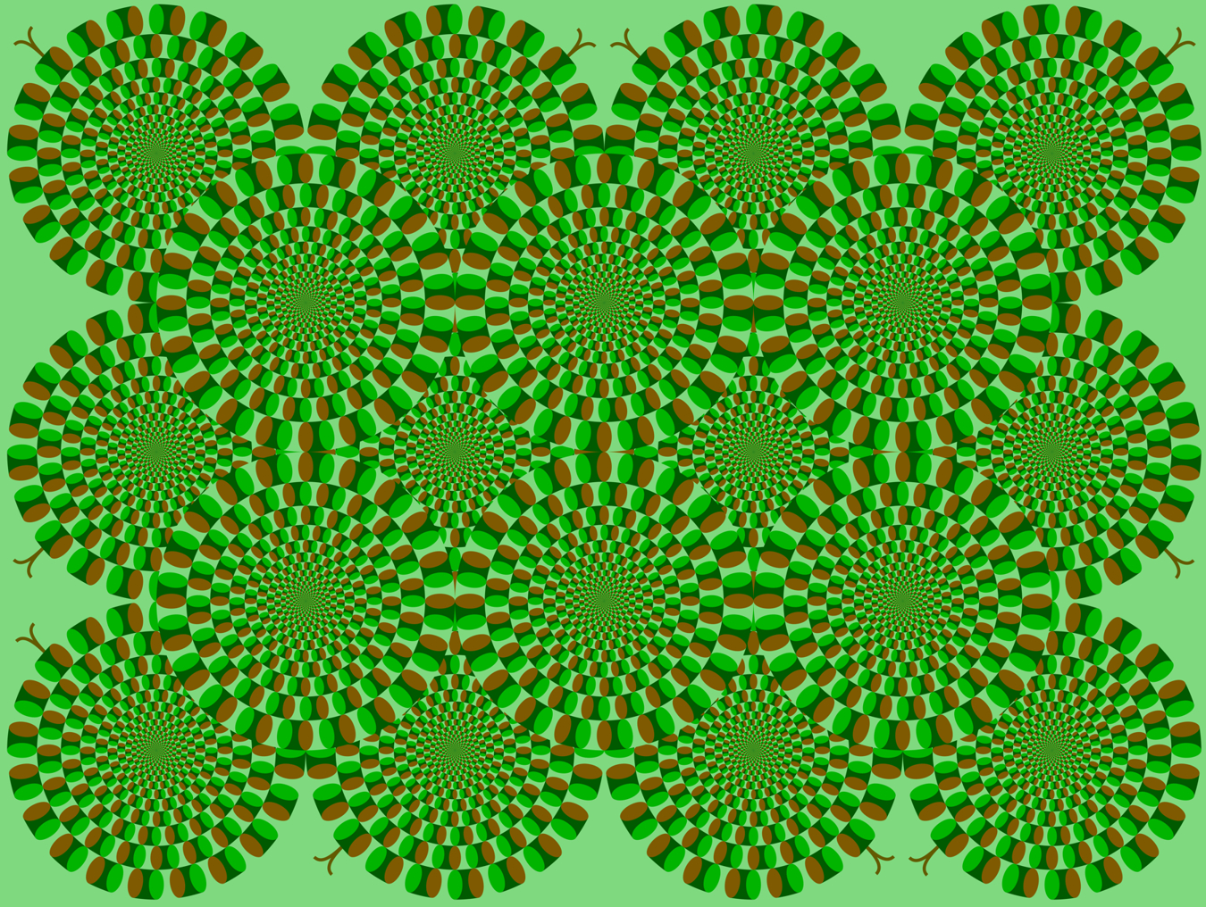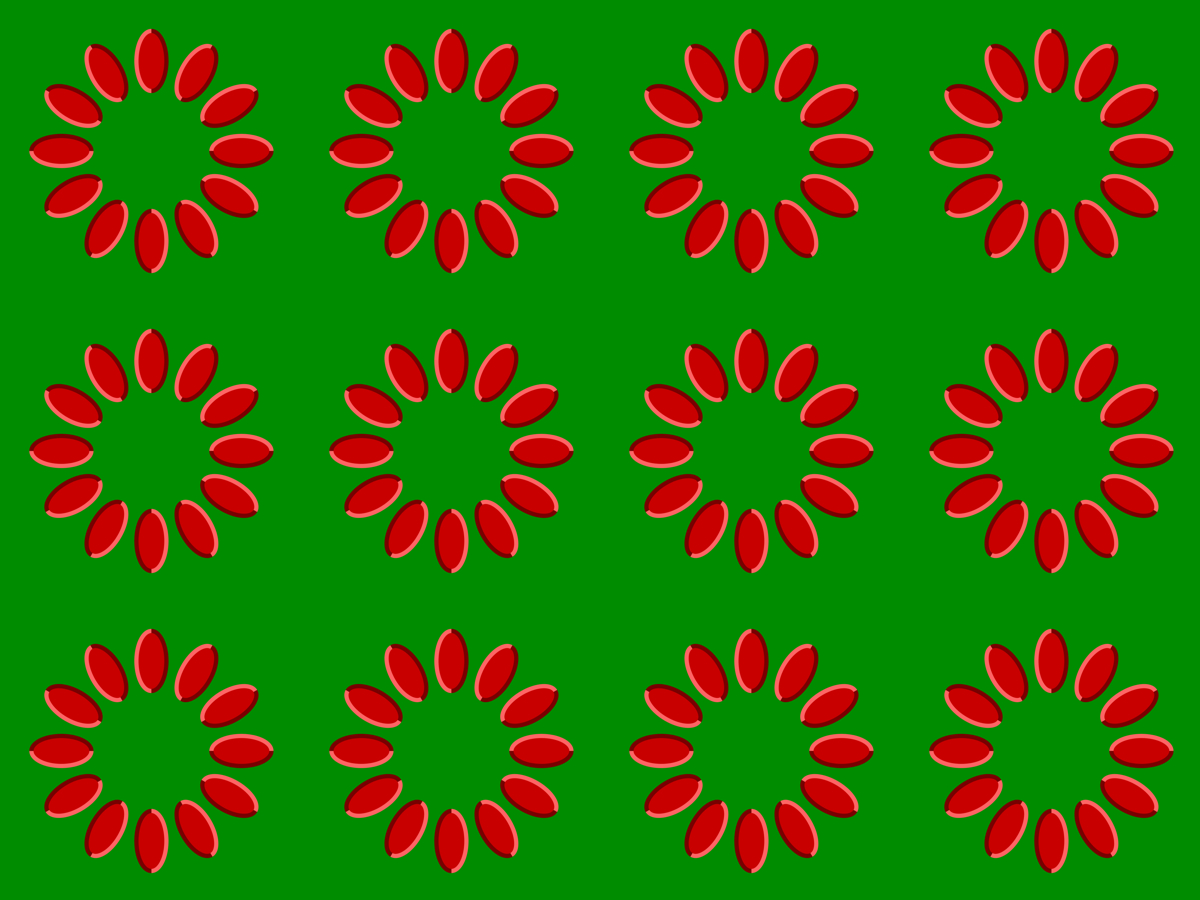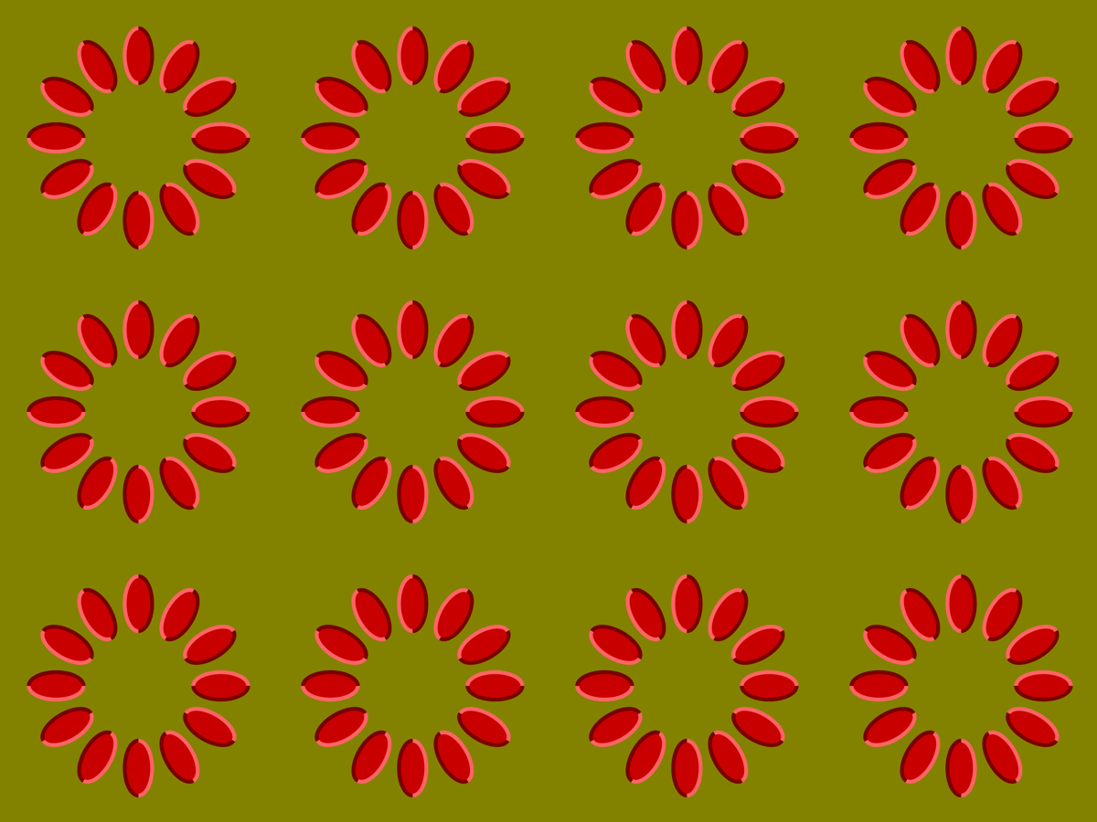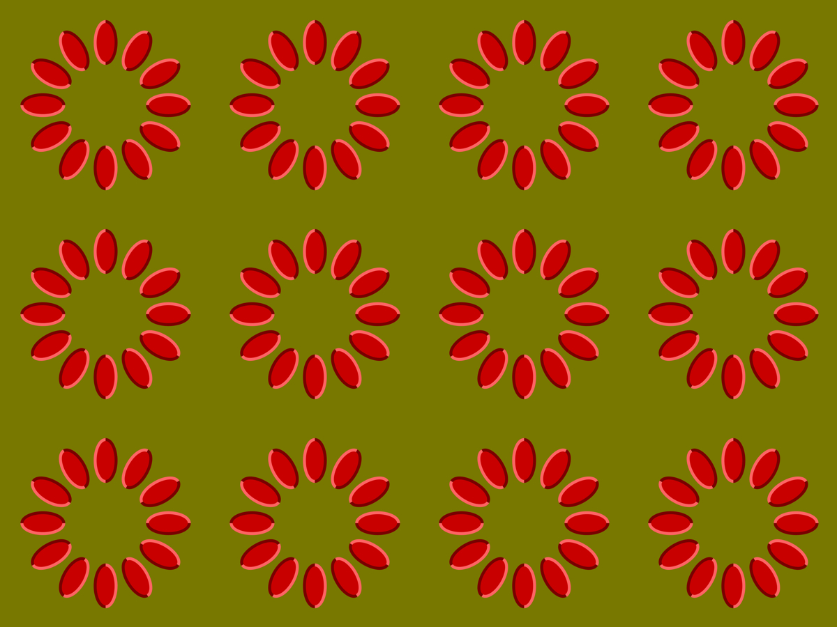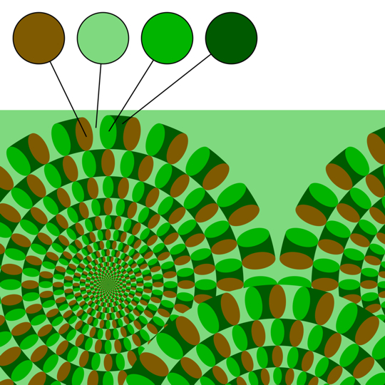 Each disk appears to rotate in the direction from red (physically brown) to white (physically light green), green, black (physically dark green), back to red (physically brown) on PC displays. Illusory motion is weak when the printed image is observed in a dark illumination.