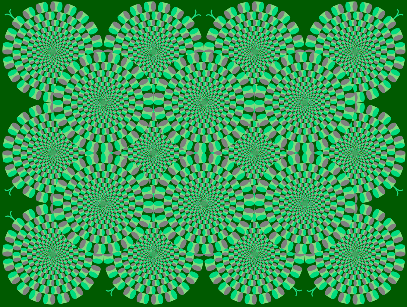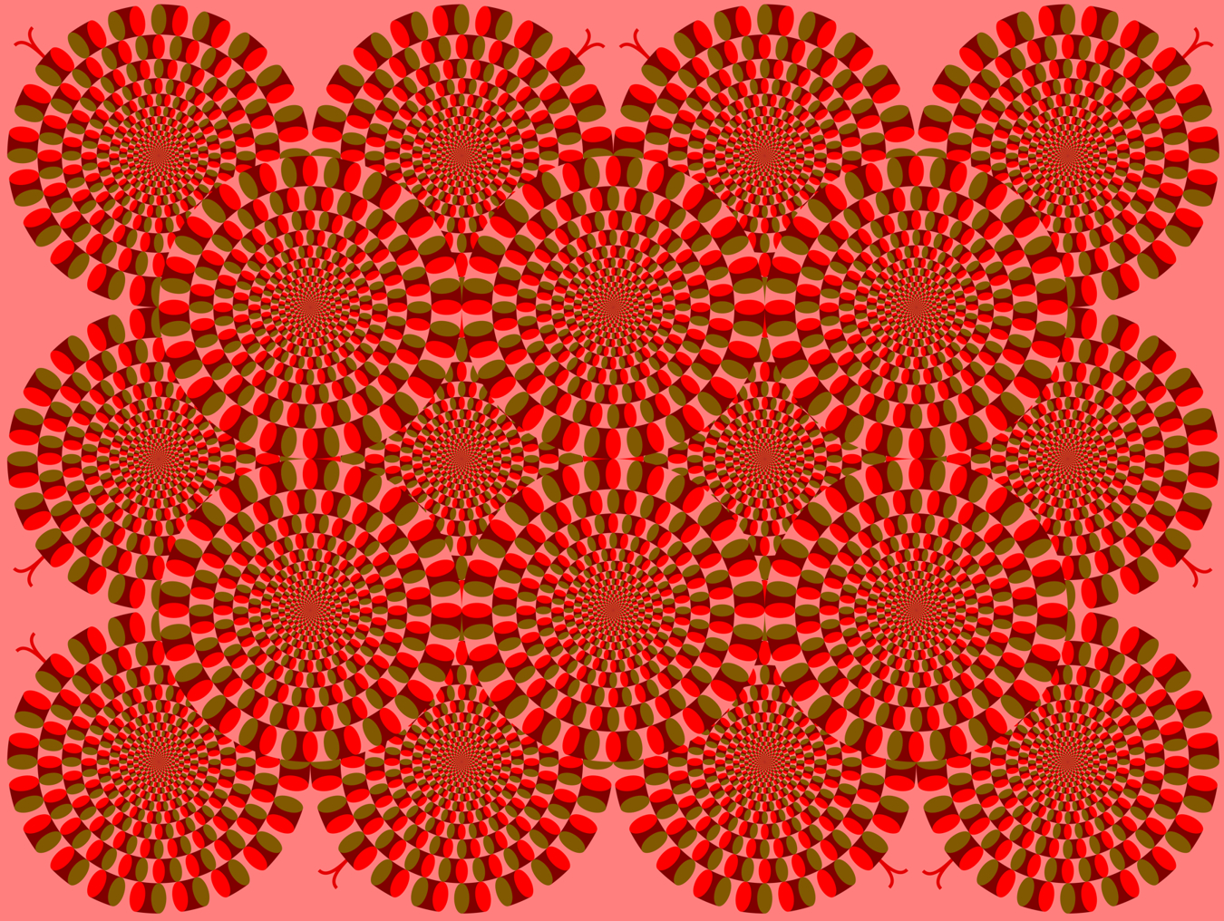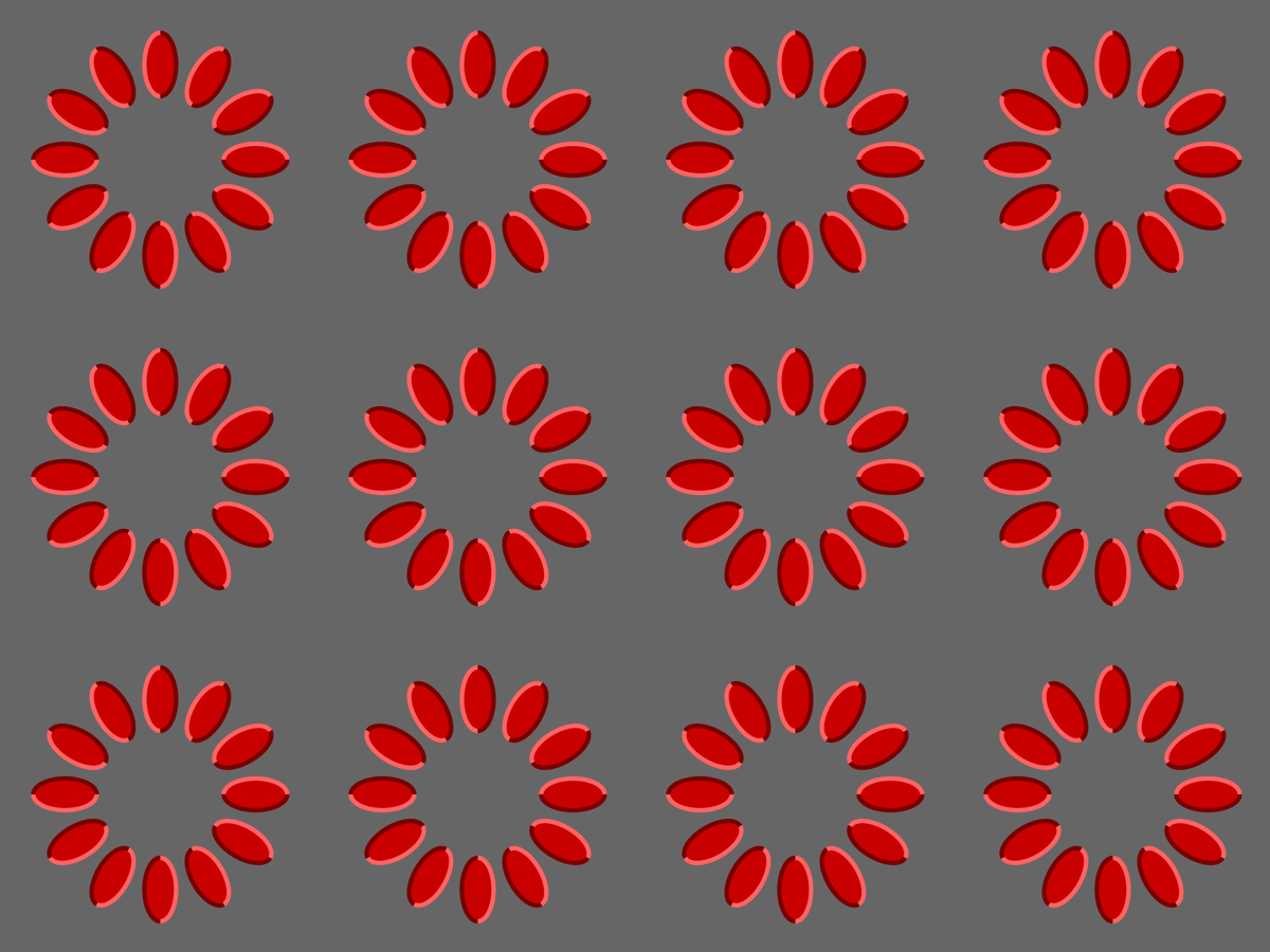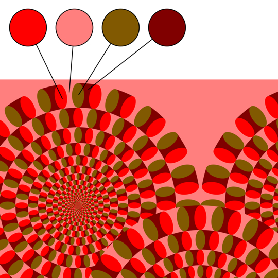 Each disk appears to rotate in the direction from red to black (physically dark red), green (physically brown), white (physically light red), back to red on PC displays. The direction of illusory motion is reversed when the printed image is observed in a dark illumination.