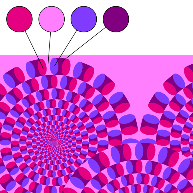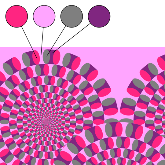 Each disk appears to rotate in the direction from red to black (physically dark red-purple), green (physically gray), white (physically light red-purple), back to red on PC displays. The direction of illusory motion is reversed when the printed image is observed in a dark illumination.