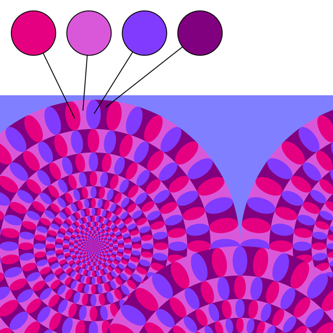 Each disk appears to rotate in the direction from red to black (physically dark red-purple), blue (physically blue-purple), white (physically light red-purple), back to red on PC displays. The direction of illusory motion is reversed when the printed image is observed in a dark illumination.