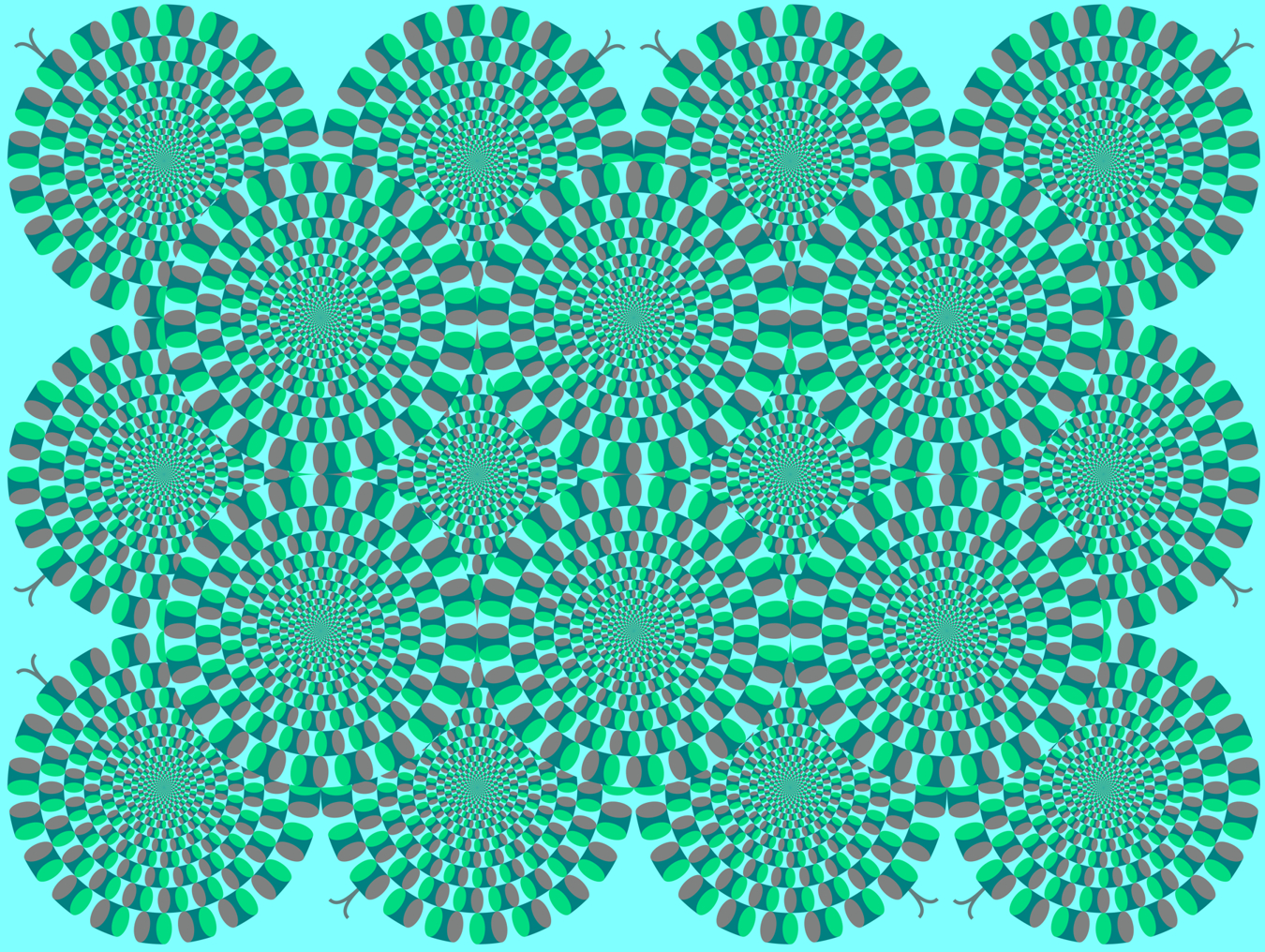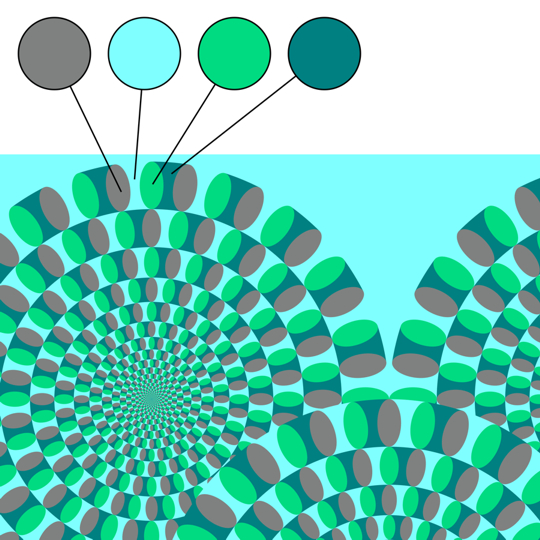 Each disk appears to rotate in the direction from red (physically gray) to white (physically light cyan), green, black (physically dark cyan), back to red (physically gray) on PC displays. Illusory motion is weak when the printed image is observed in a dark illumination.