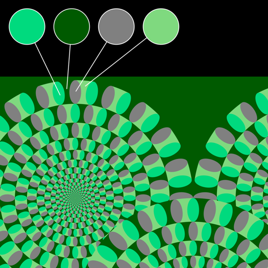 Each disk appears to rotate in the direction from green to black (physically dark green), slightly reddish color, yellow (physically light green), back to green on PC displays. Illusory motion is weak when the printed image is observed in a dark illumination.