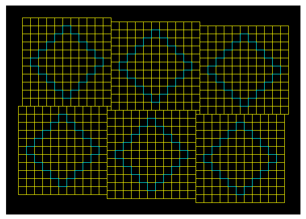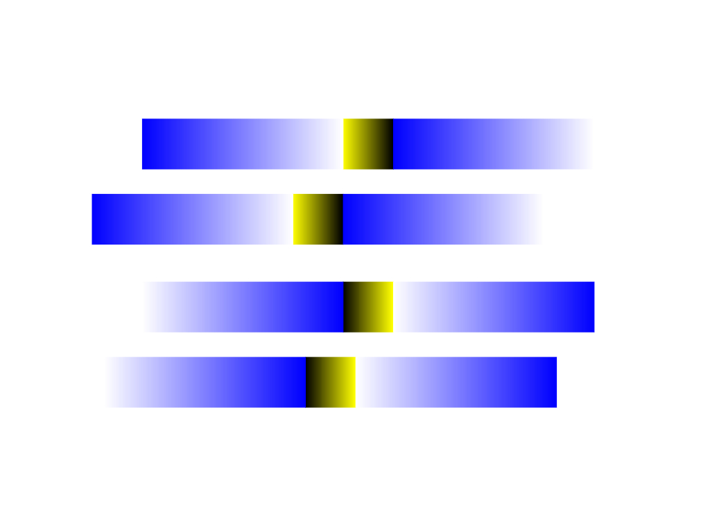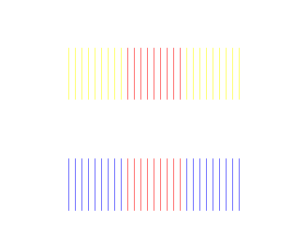 The whole width of the red grating in the upper row appears to be narrower than that of the red grating in the lower row, though they are identical. Moreover, the number of the line segments of the former appears to be fewer than that of the line segments of the latter, though they are identical. Furthermore, the interval of the line segments of the former appears to be larger than that of the line segments of the latter, though they are identical. I imagine that this phenomenon is spatial frequency contrast induced by apparent low spatial frequency of the flanking yellow gratings, which appear to be smaller as they are because it is of low contrast. In addition, the upper red appears to be slightly bluish while the lower one appears to be orange. This color illusion may be kind of the remote color contrast. Finally, the height of the upper red grating might appear to be slightly taller than that of the lower one.