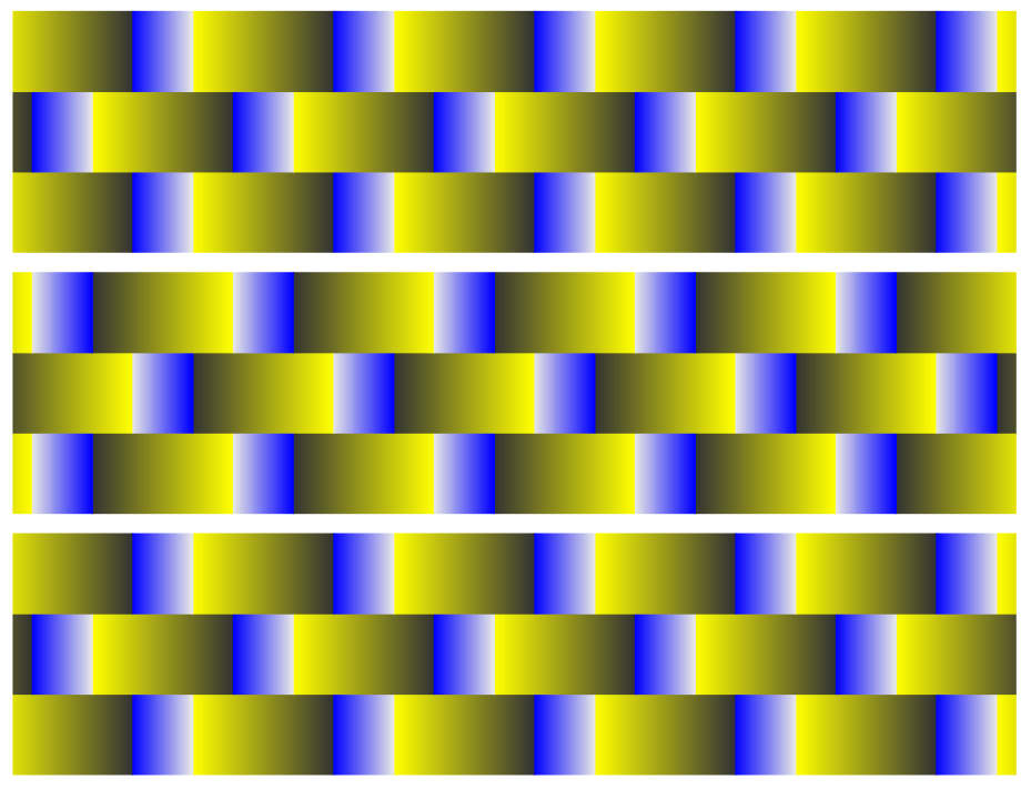 The upper and lower blocks appear to move rightward while the middle one appears to move leftward.