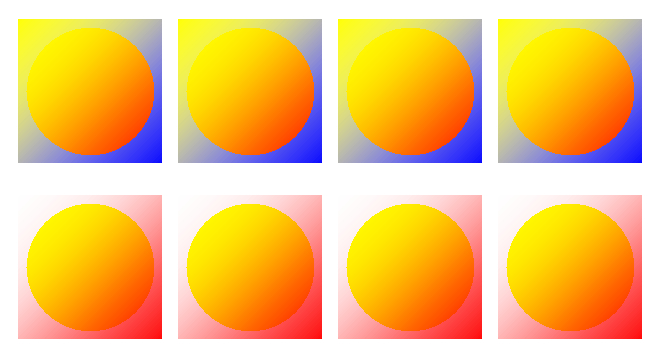 The color of the circles in the upper low appears to be orange while that in the lower row appears to be yellowish. Actually, both are the same color gradation.