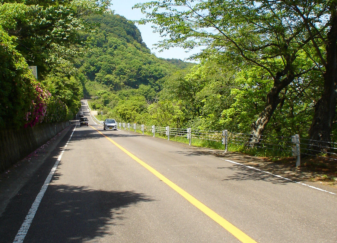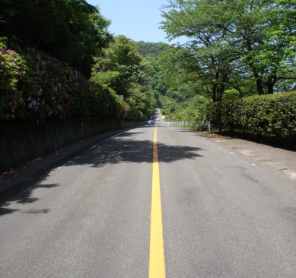 The nearer slope appears to descend, though it ascends actually. This antigravity hill illusion (gravity hill illusion, magnetic hill illusion or spook hill illusion) can be observed in the Yashima Drive Way, Mt. Yashima, Takamatsu City, Japan.