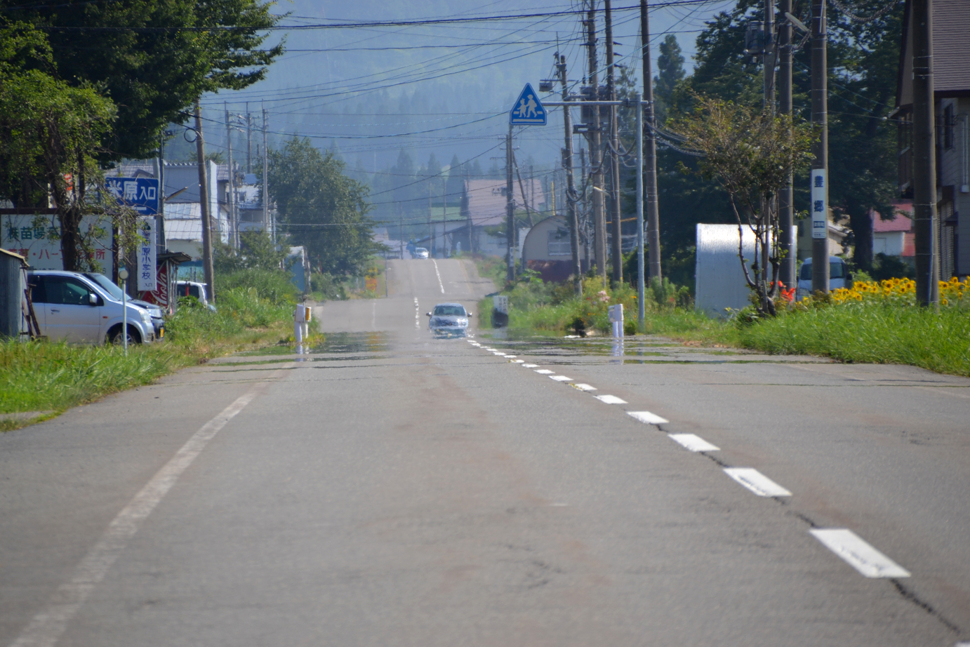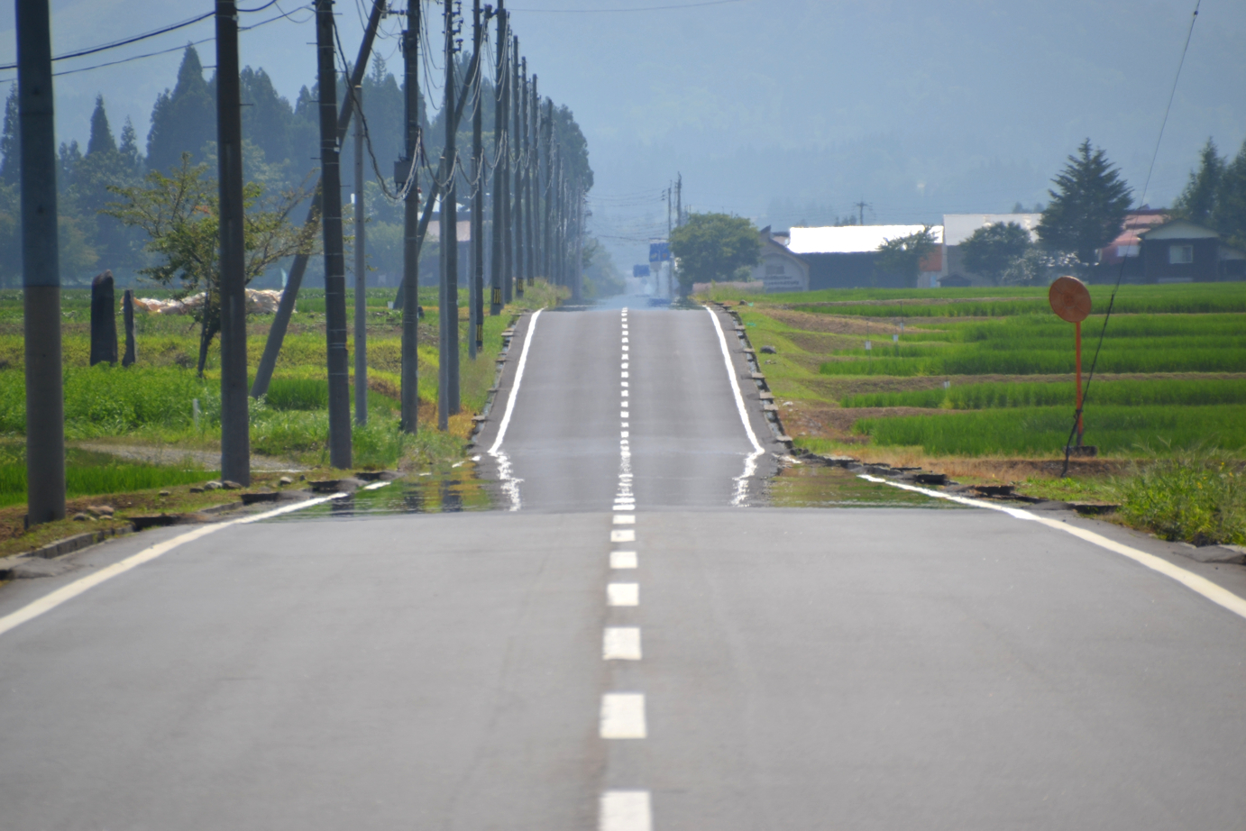 蜃気楼の向こうは下り坂に見えるが、上り坂である(1.0度、1.7%)。