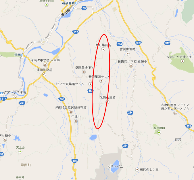 場所:新潟県十日町市原町から中魚沼郡津南町源内山までの約5kmのほぼ直線区間。一部は国道117号線からニュー・グリーンピア津南へ向かう県道(482号線)のため交通量が多い。坂道錯視の起こるポイントが8箇所あった(これまで調査した中では断トツで最多)。下(北側)から、十日町市に3箇所(調査済)、十日町市と津南町の境界の集落付近に1箇所(未調査)、津南町に4箇所(調査済)である。