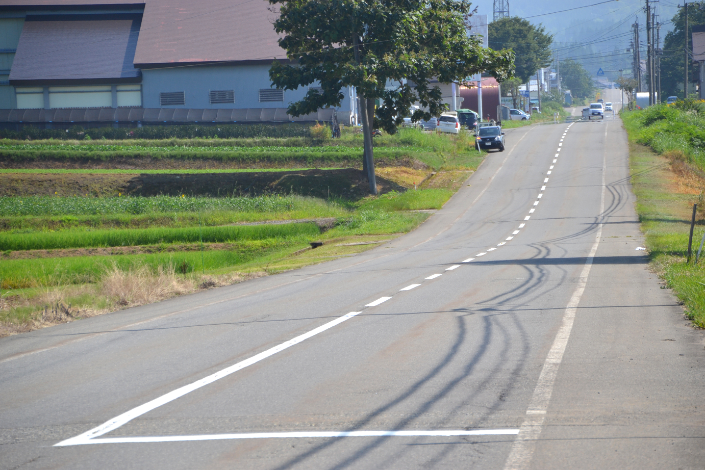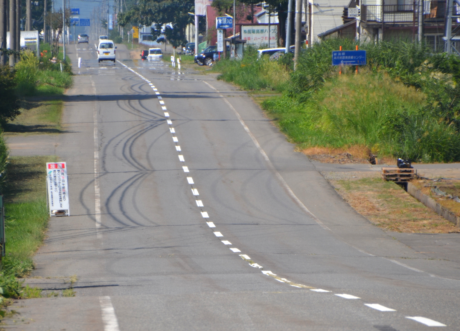 センターラインが薄くなっているところは上り坂に見えるが、下り坂である(0.8度、1.4%)。