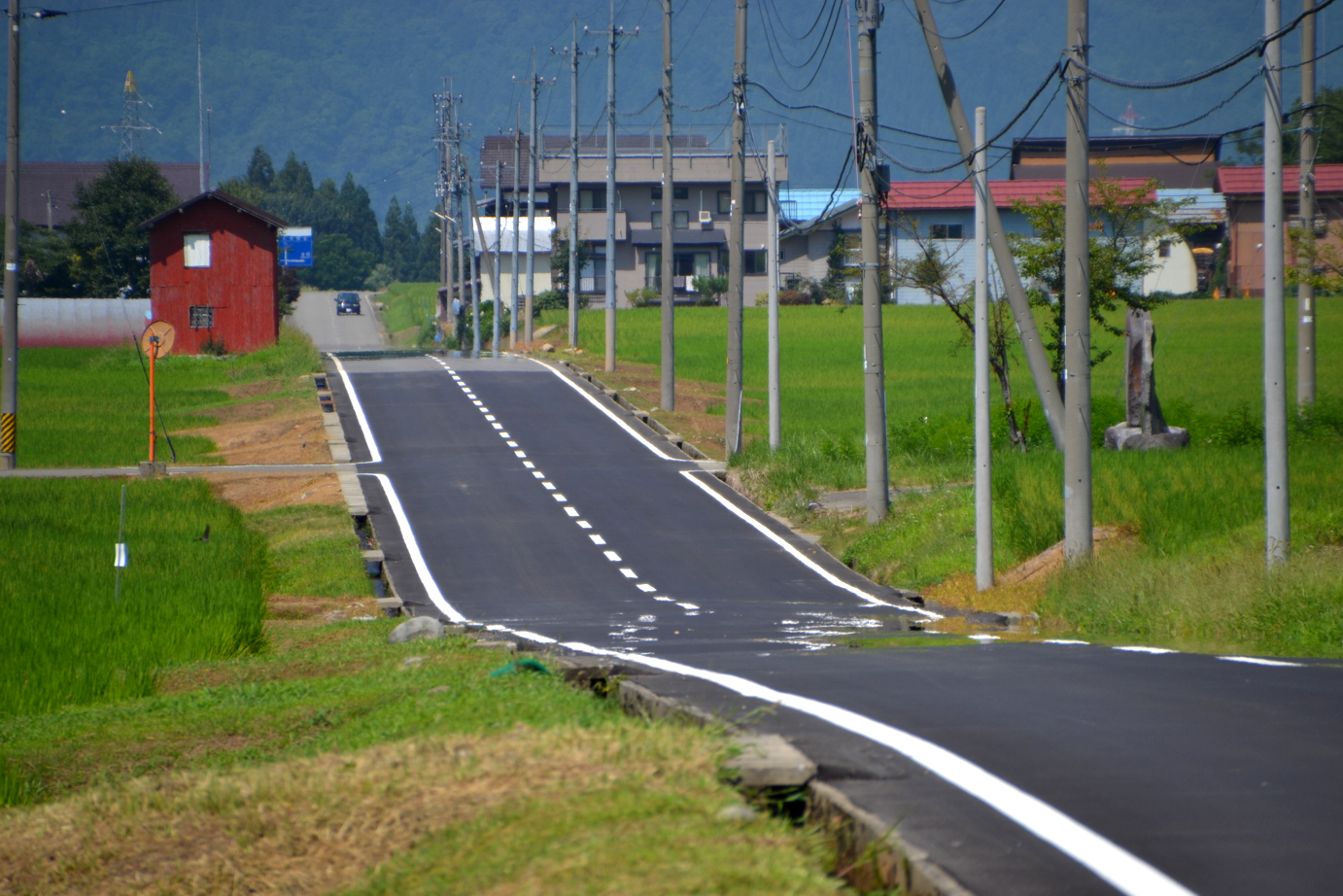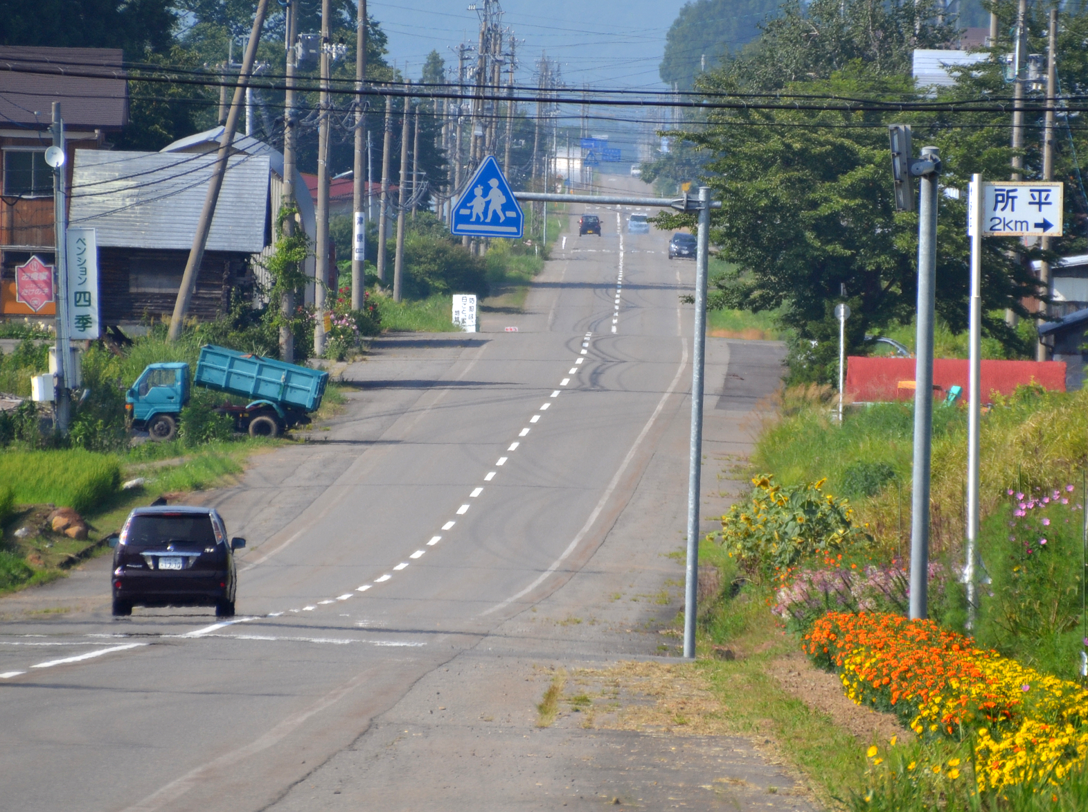 軽トラのいるあたりが上り坂に見えるが、下り坂である(1.5度、2.6%)。