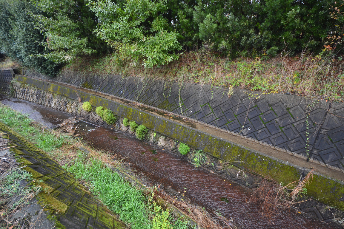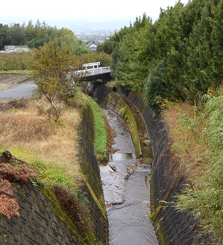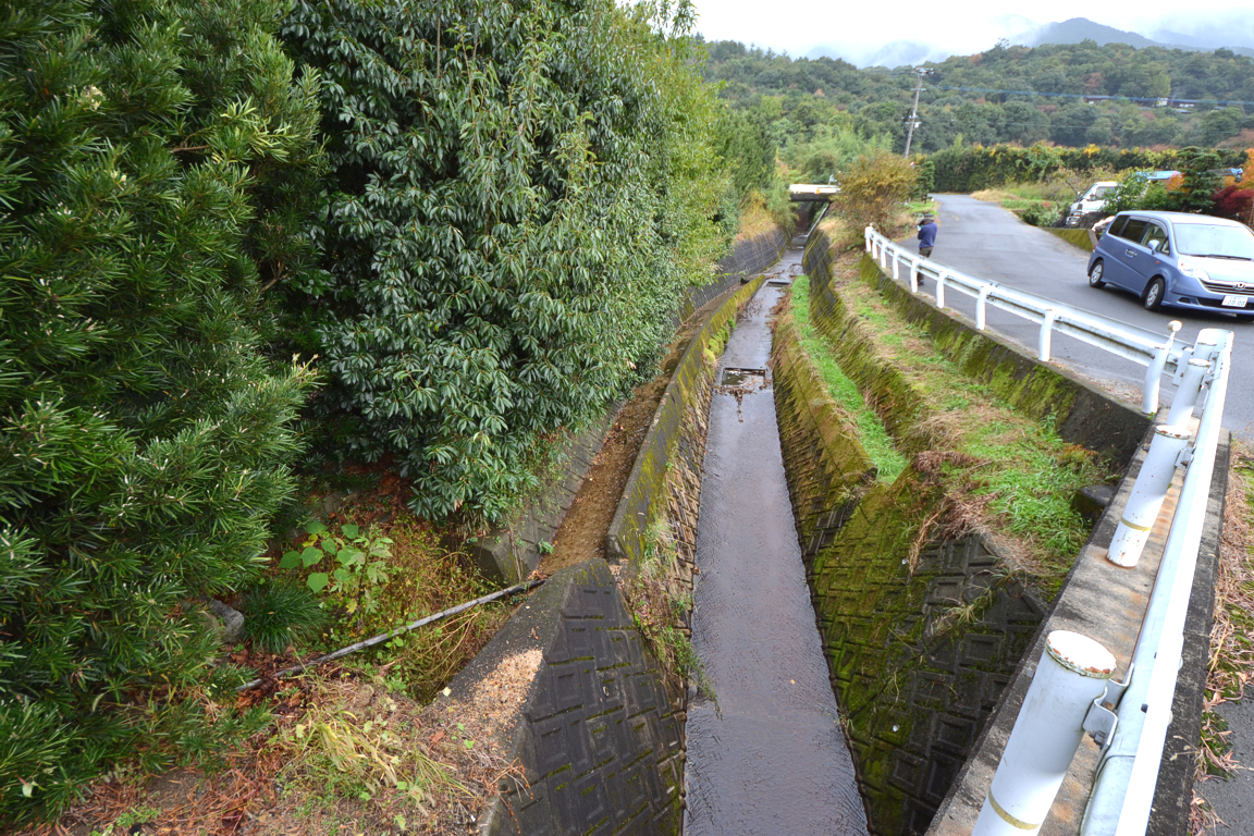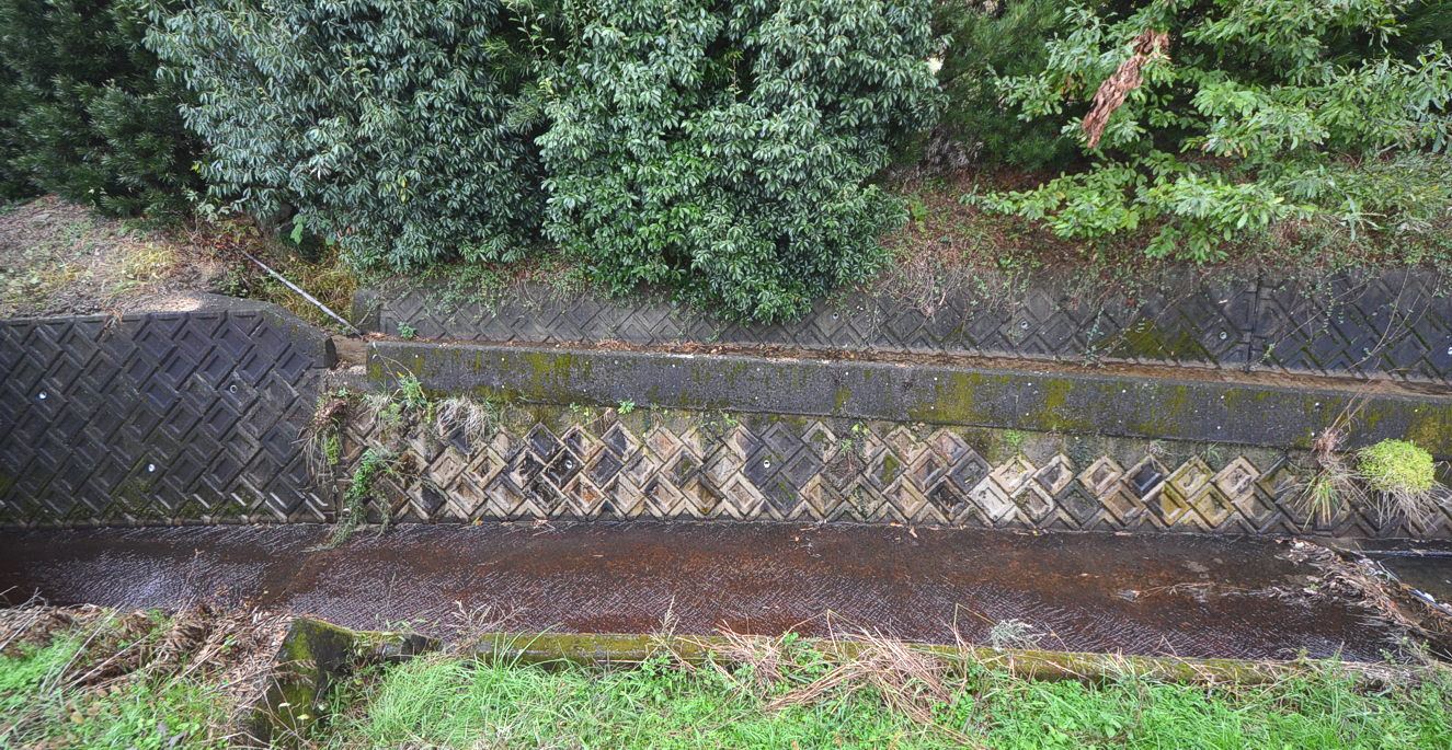 一段上の幅の狭い水路は左が高く見えるが、水は右から左に流れる。
