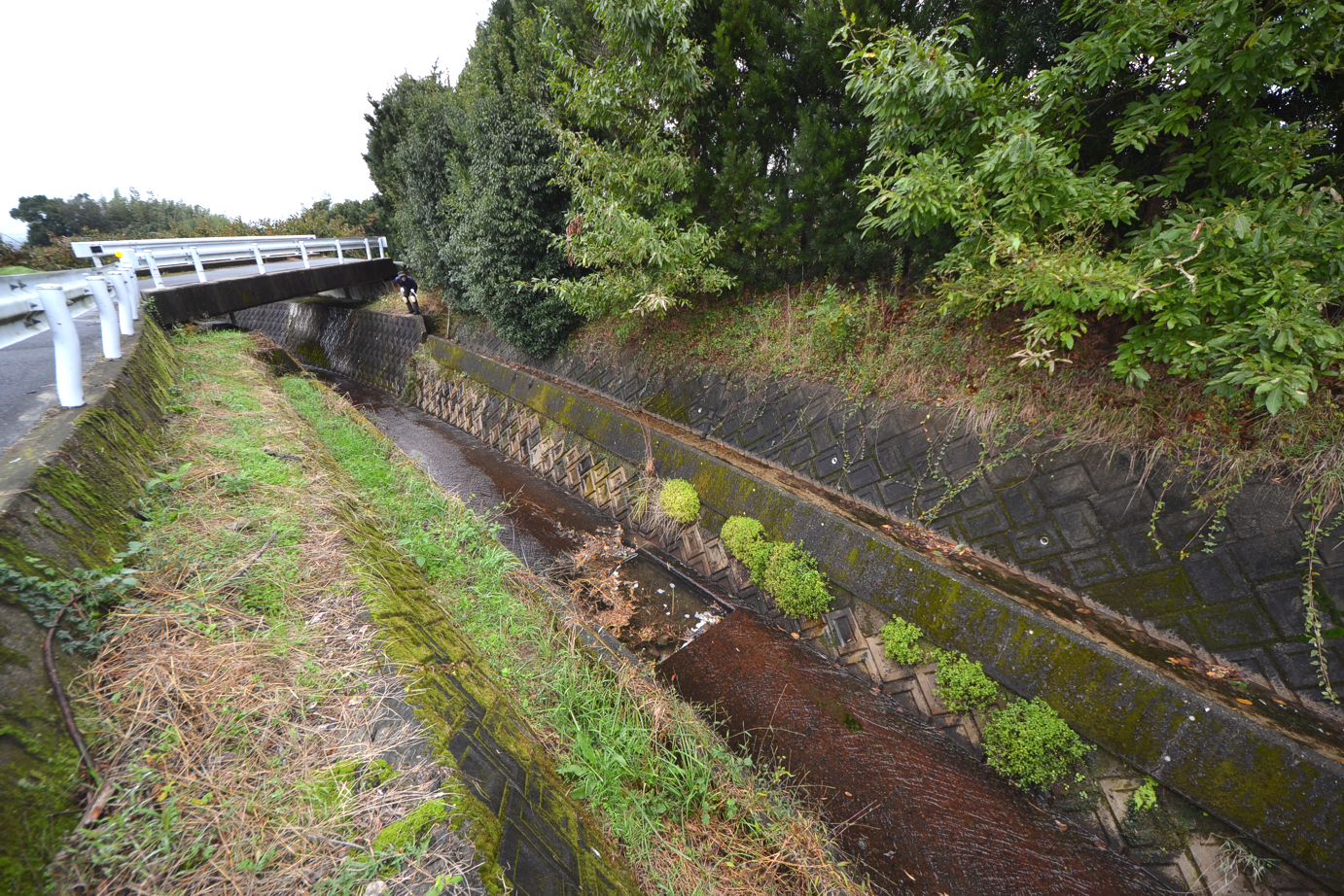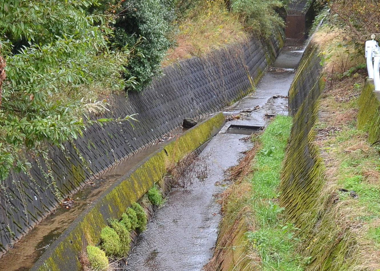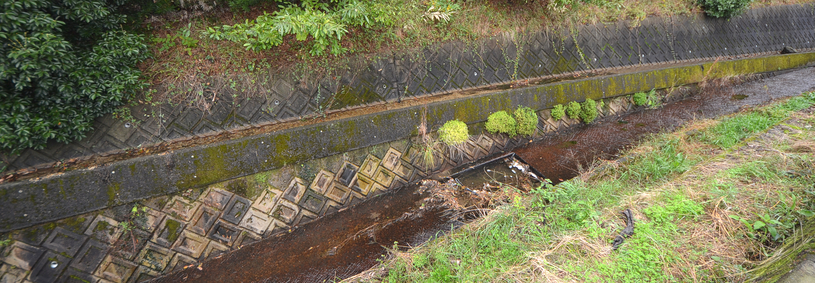 一段上の幅の狭い水路は左が高く見えるが、水は右から左に流れる。