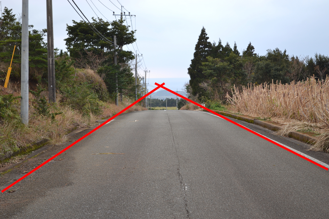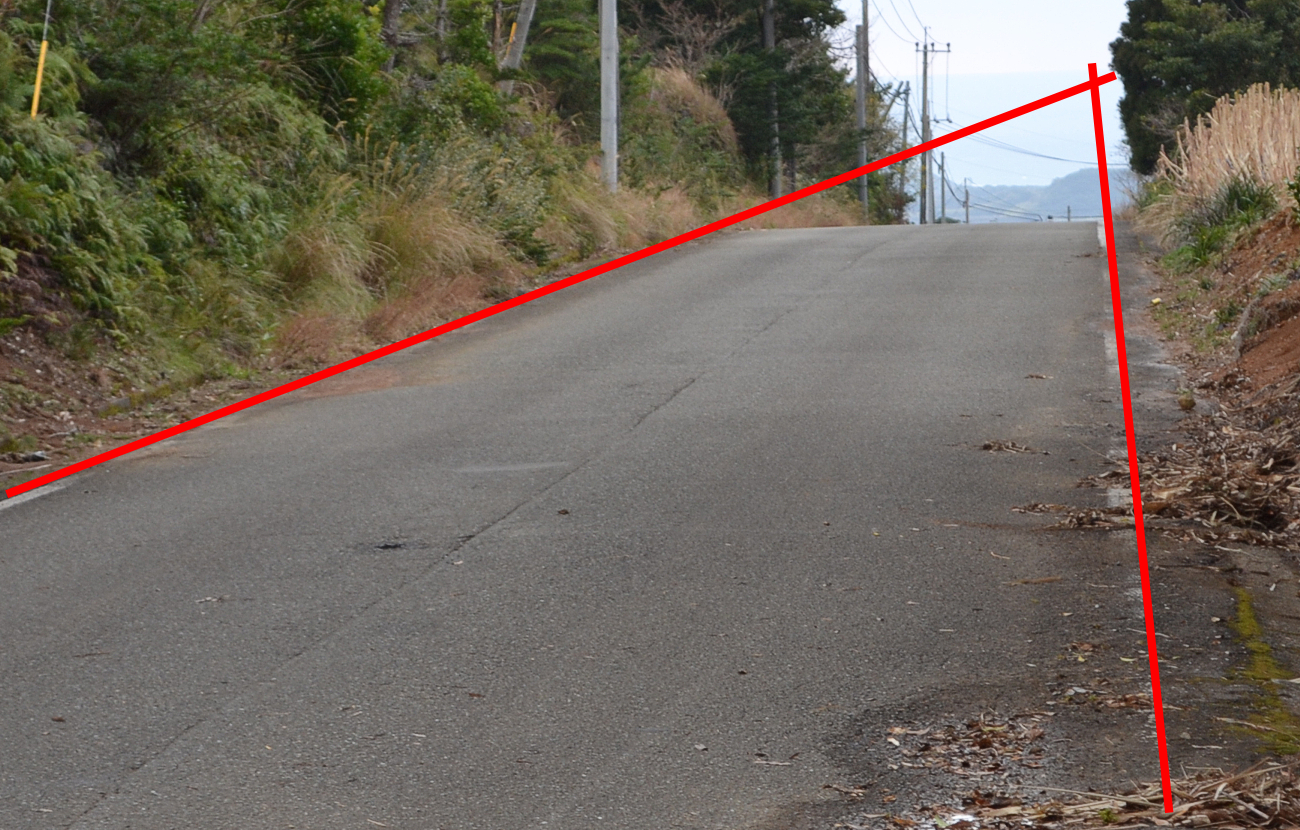 写真で確認しても下り坂である。もし上り坂なら、消失点(赤線の交点)は水平線よりも上になければならないからである。