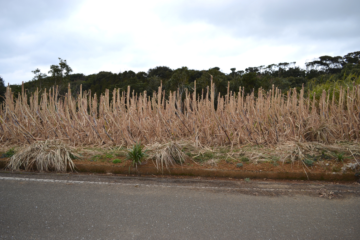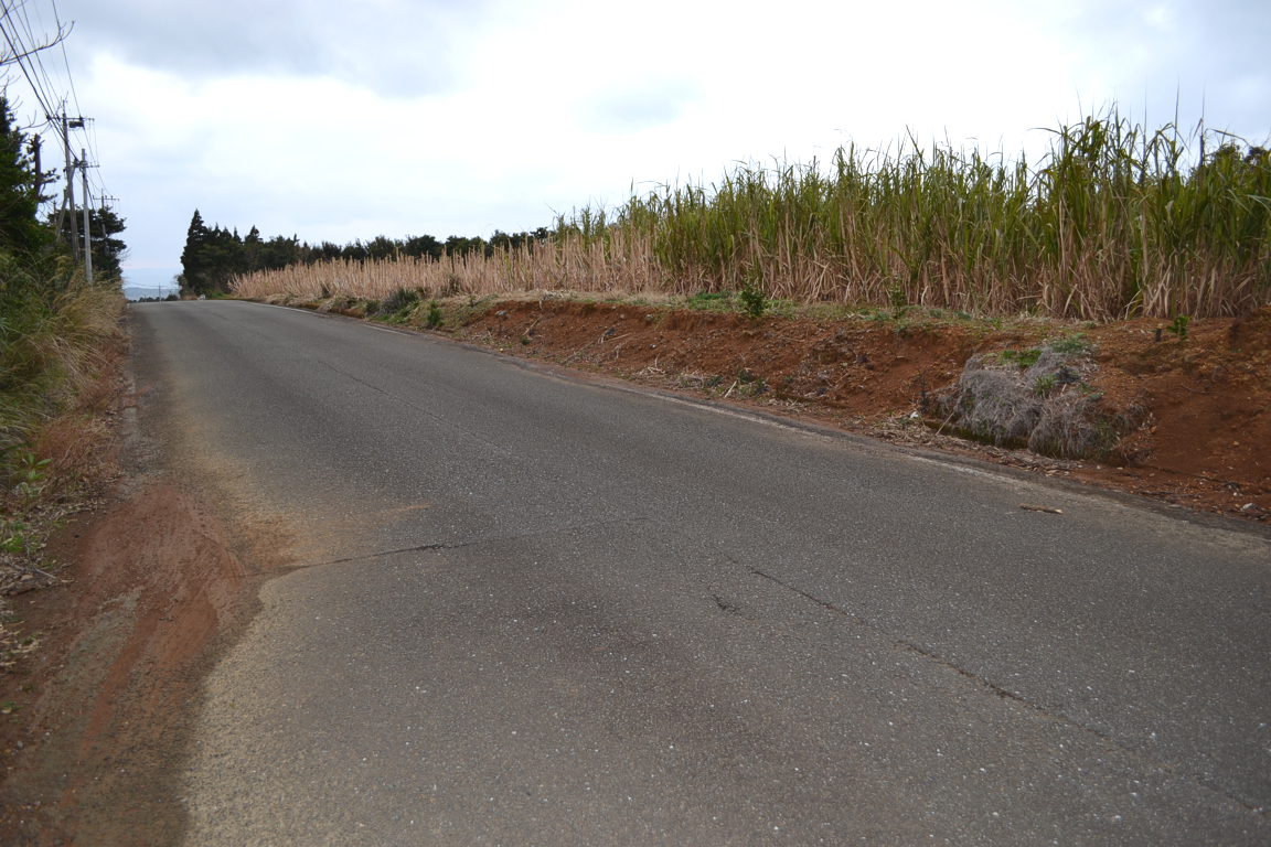 サトウキビ畑の切り通しの形も錯視に寄与していそうである。