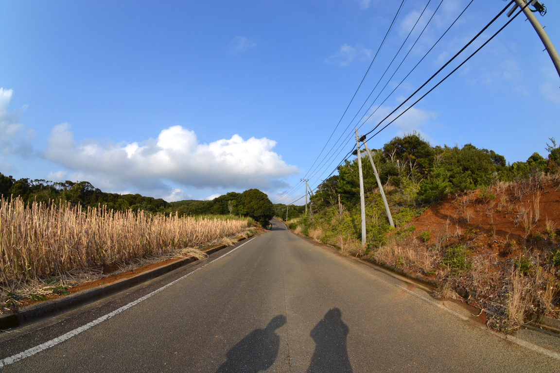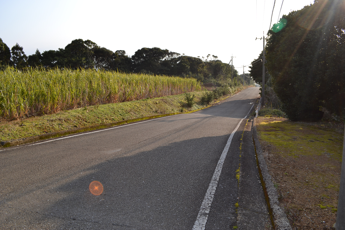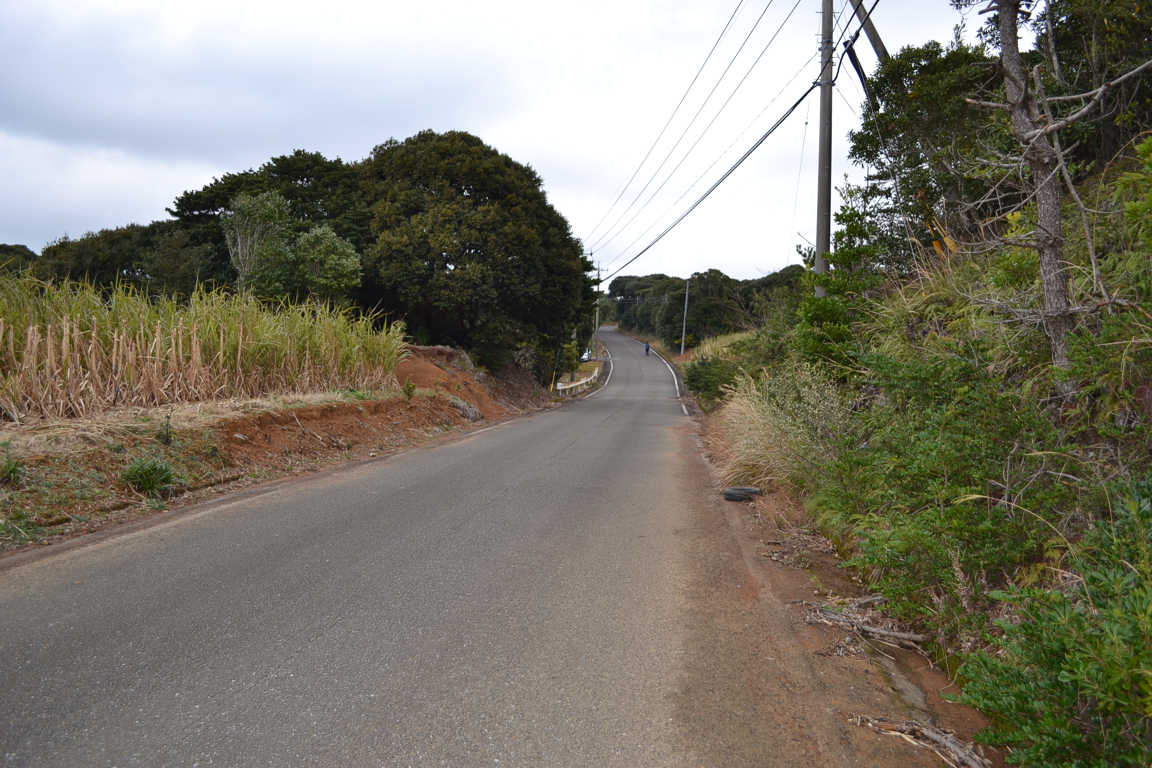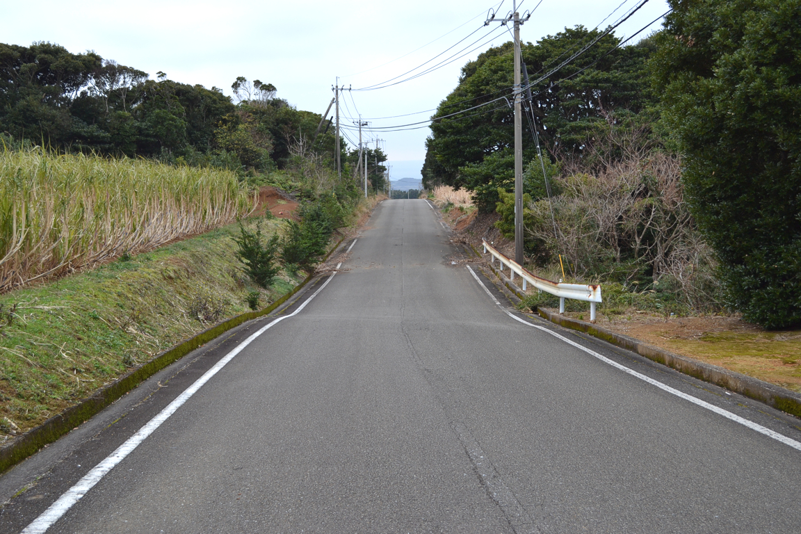 サトウキビ畑の切り通しがよく見えないこの位置からでも、下り坂が上り坂に見える。