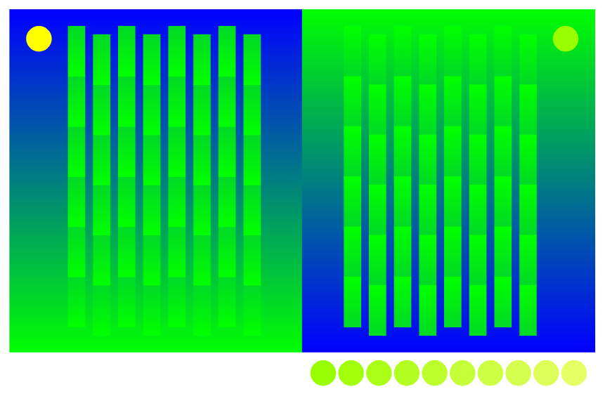 Rectangles are shaded in the same way, but appear to be different from each other. In addition, the moon in the right image appears to be yellowish, but it is identical to the leftmost green circle placed below the image.