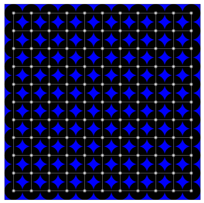 The white grid appears to be in front of the black disks. The illusory black dots are the scintillating grid illusion or the Bergen illusion. This illusion disappears when we keep blinking! In addition, the white grid sometimes appears to be yellowish.