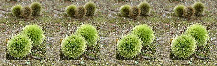Cross-fusers see the two green kuri in front of the background while uncross-fusers see them behind the plane.