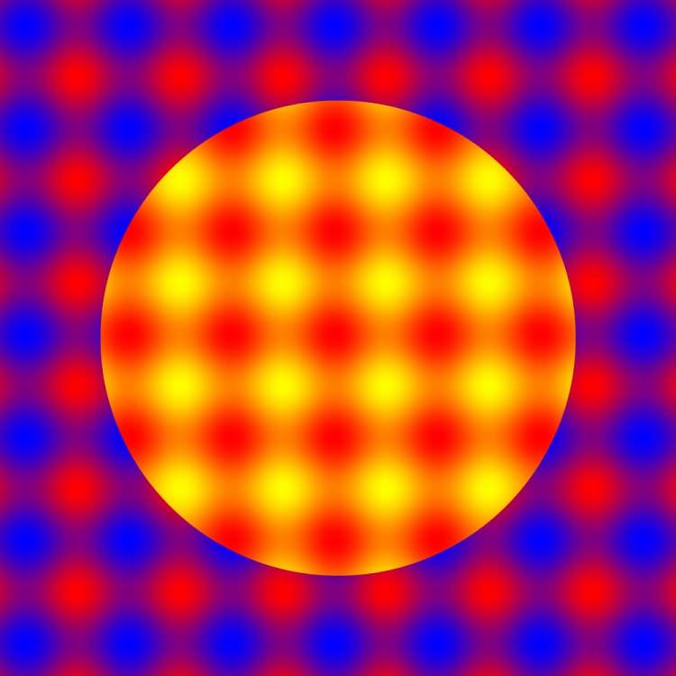 The lower-left group appears to be a checkerboard of yellow and red squares superimposed by oblique streaks of blue "mist", while the upper-right group appears to be a checkerboard of yellow and blue squares superimposed by oblique streaks of red "mist".