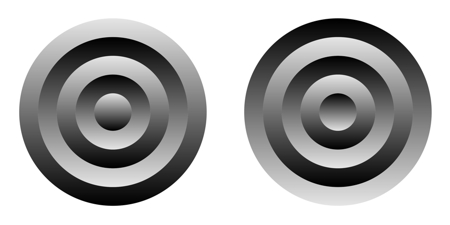 In the left image, the outermost ring, the third one and the central circle tend to be figure: i.e. they tend to appear to be in front. Sometimes, for a shorter time, they appear to be ground: i.e. they appear to be located behind the second and fourth rings as a background. The right image shows the upside-down appearance of the left one. In this inverted image, the tendency which appears to be in front is reversed: i.e. the second and fourth rings tend to be figure. This image is adopted from the cover design of a psychology textbook shown below, with permission.