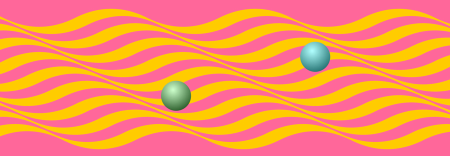 In the upper image, the left green ball appears to be located in a valley while the right light-blue one appears to be placed on a slope. This relationship is reversed when the image is inverted, as shown in the lower image.