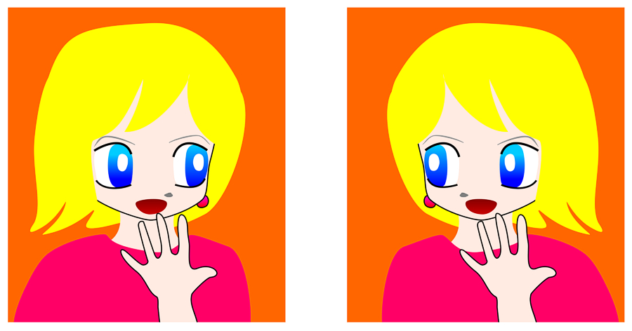 The hand in the left image appears to be her left hand while that in the right image to be her right one, though they are the same in shape.