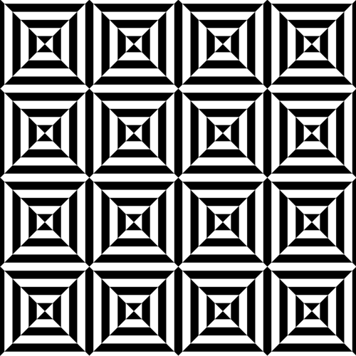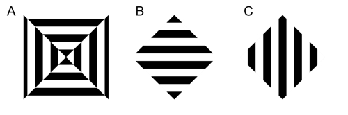 Sixteen squares of the pattern A in the image below are observed. Or, twelve diamonds of the horizontal pattern B are perceived in front of the background of a vertical stripe. Or, twelve diamonds of the vertical pattern C are perceived in front of the background of a horizontal stripe.