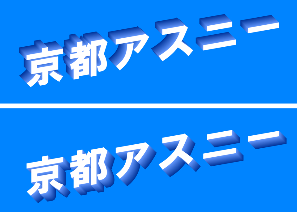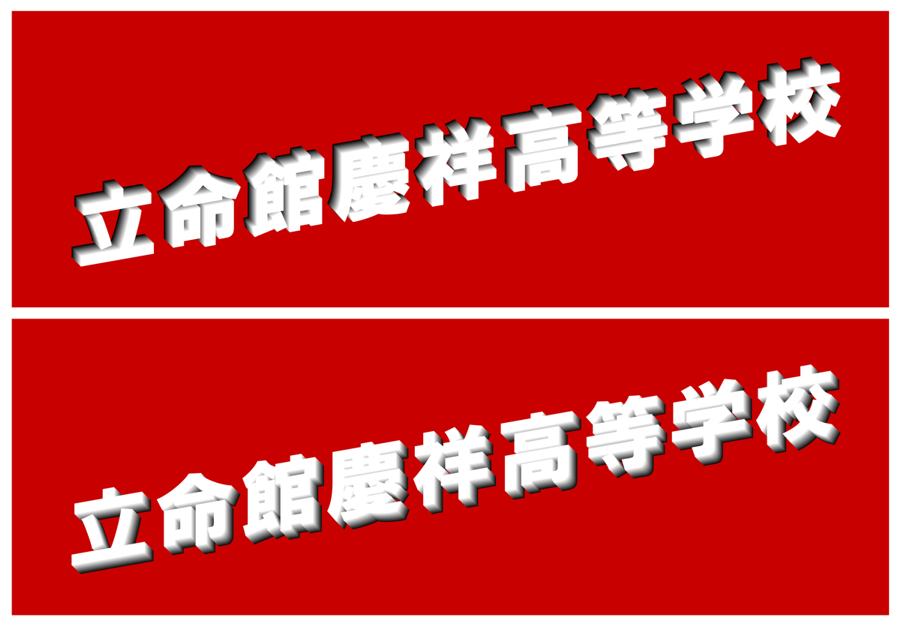 The white words in the upper block is of the same shape and at the same position as those in the lower block, but their orientations in depth appear to be different from each other. In the former, the normal vector of the words appears to head downward, whereas in the latter that appears to point upward.
