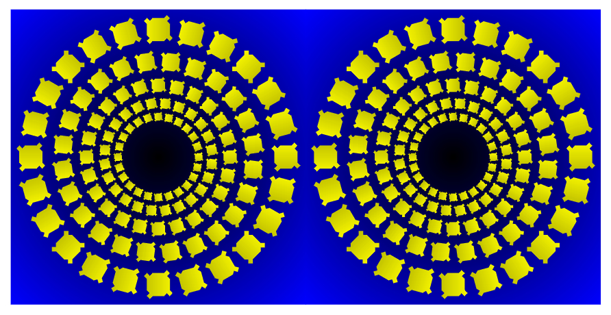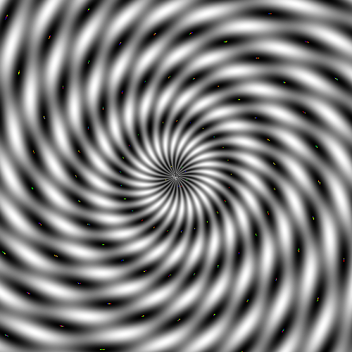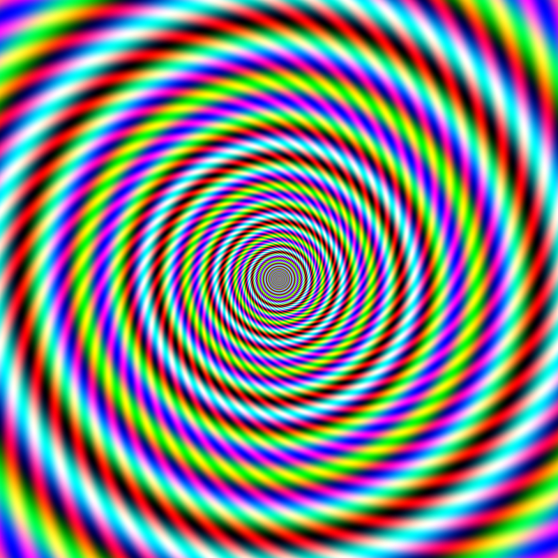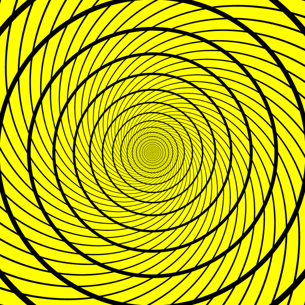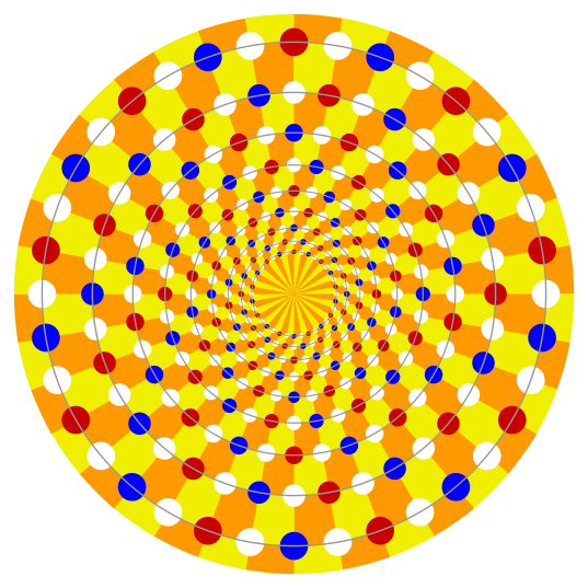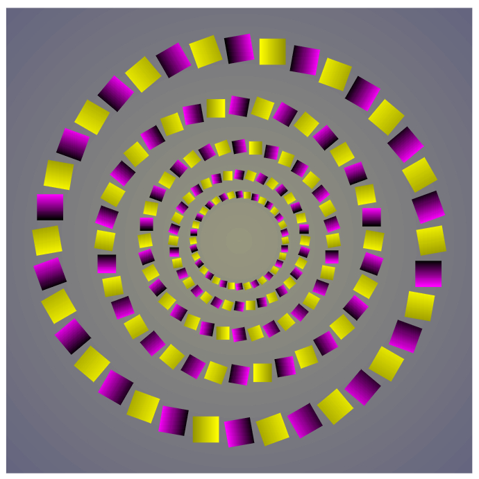 Concentric rings appear to be spirals. Moreover, each set of rings appears to rotate.