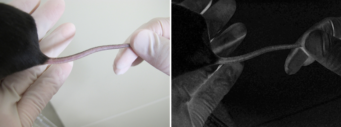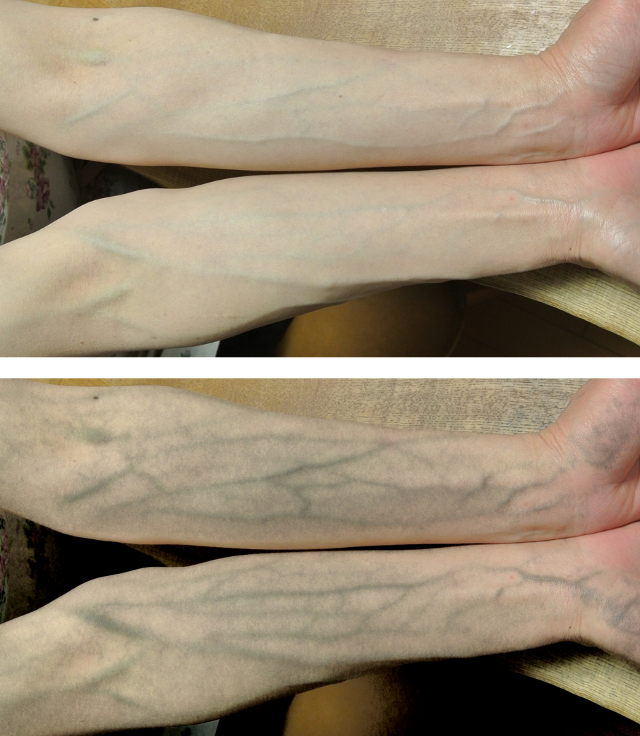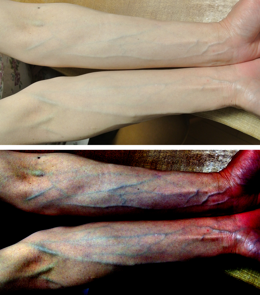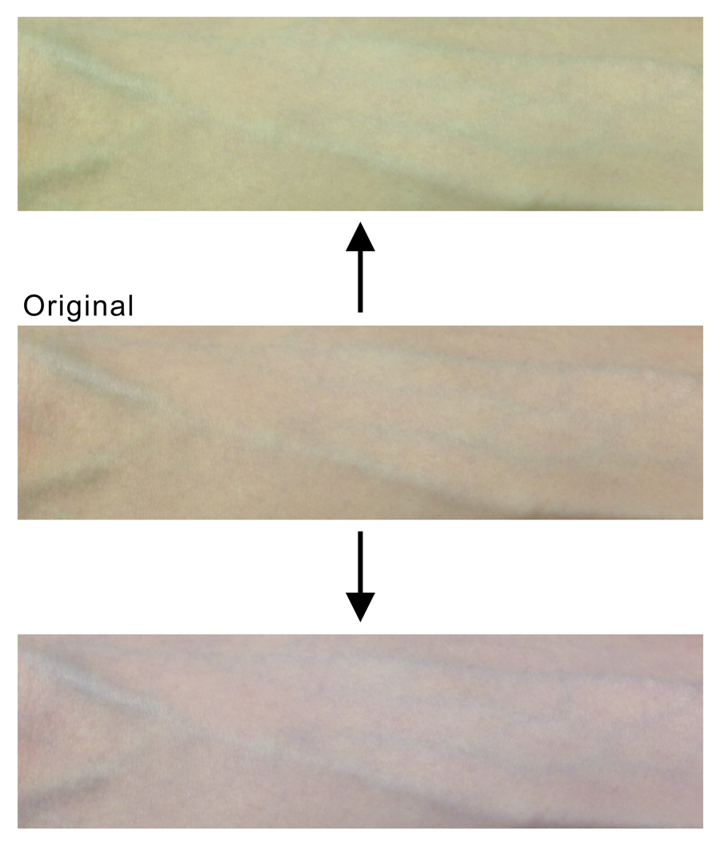 上図がオリジナルの写真。静脈は青く見えるが、画素は「肌色」(オレンジ色から黄色の色相)である。この画像を変換して、画素も青い静脈の画像を作ることができるが、静脈以外のところは画素は青いのに赤みがかって見えるような変換(色の恒常性を保つ変換)もできる(下図)。つまり、写真を撮る条件によっては、画素も青い静脈でありながら自然な感じの画像も得られることが予想できる。ということは、下図のような画素の青い静脈の写真を証拠として提出し、「静脈が青く見えるのは色の錯視である」 という考え方を否定する論者が現れるかもしれない。しかし、その場合でも、錯視研究としては考えを改める必要はないと考える。その最大の理由としては、たとえば上図では色の錯視が成立しているからである。さらに、下図の場合は、「静脈でないところには赤みが見えるのに、画素は青い」という「非静脈錯視」とでもいうべき画像となっているので、錯視研究はやめられない。