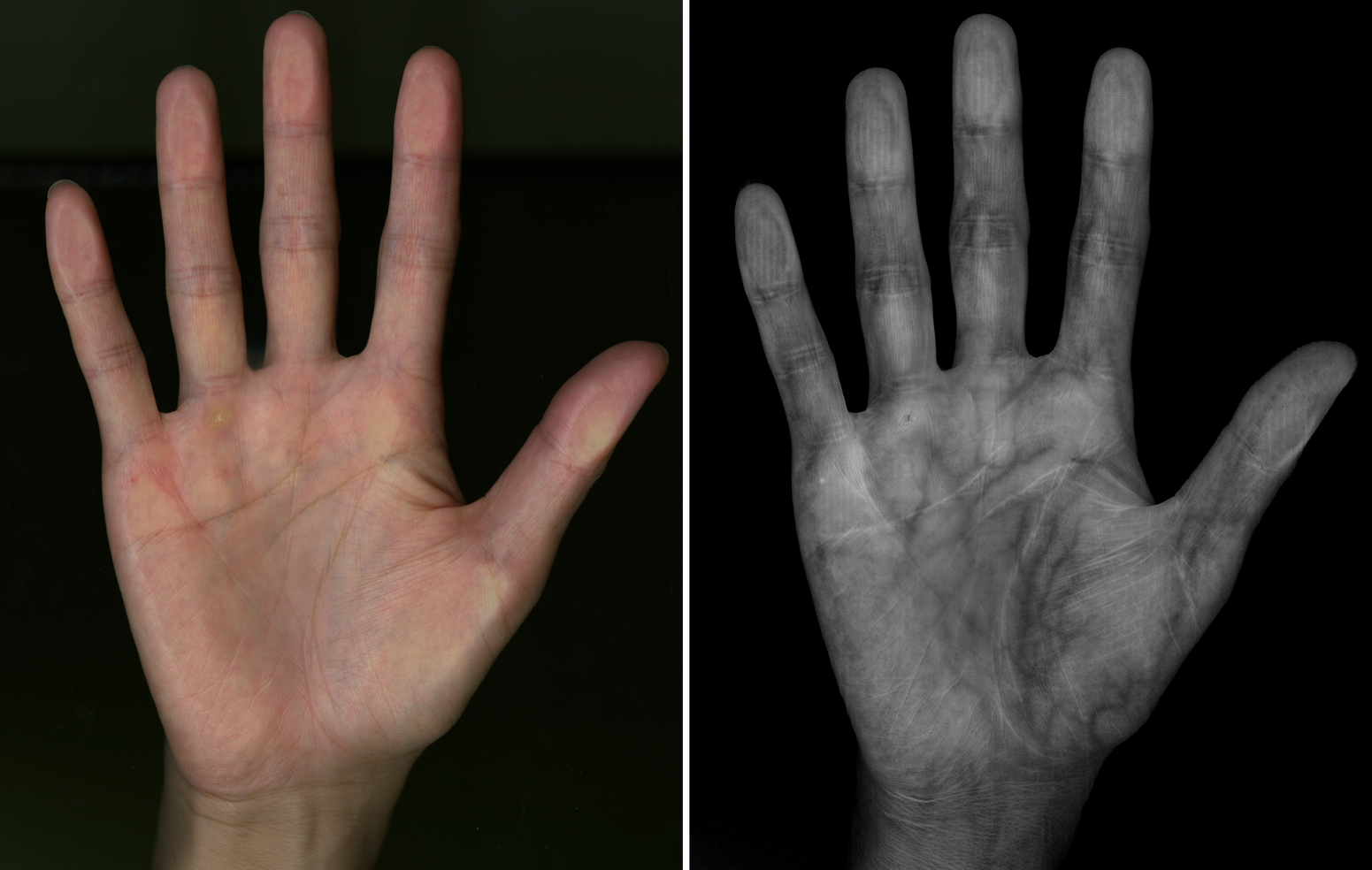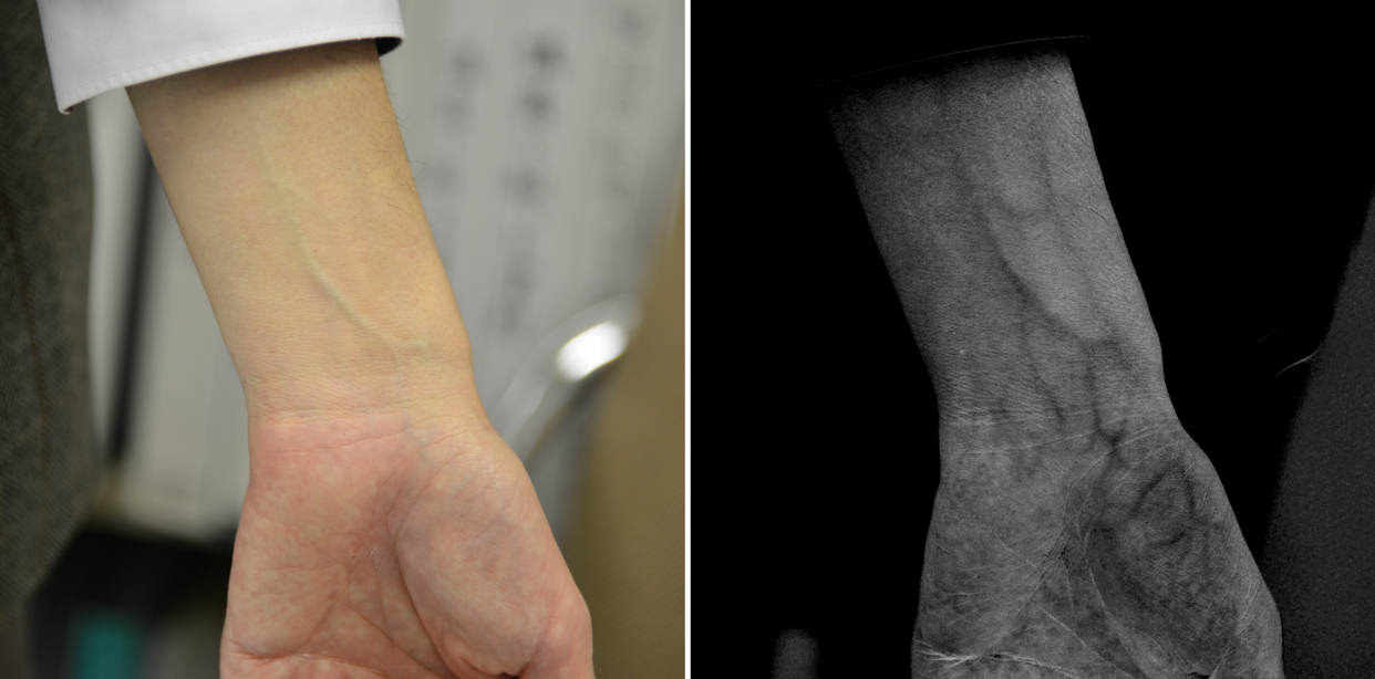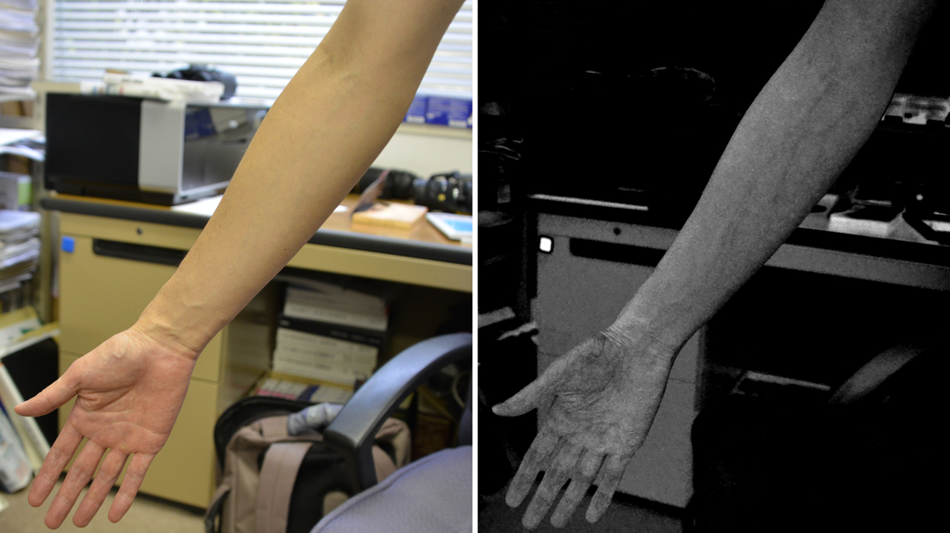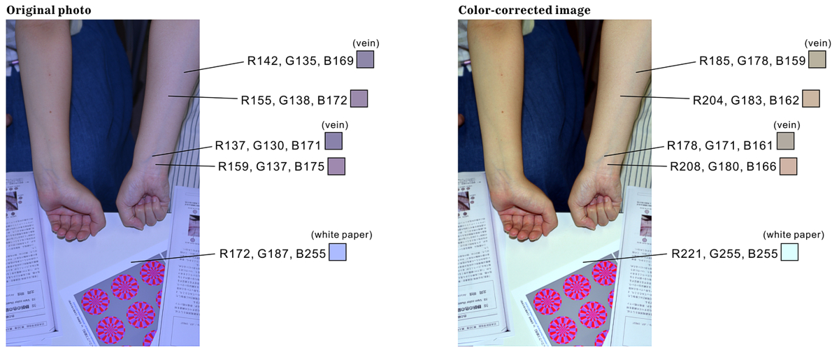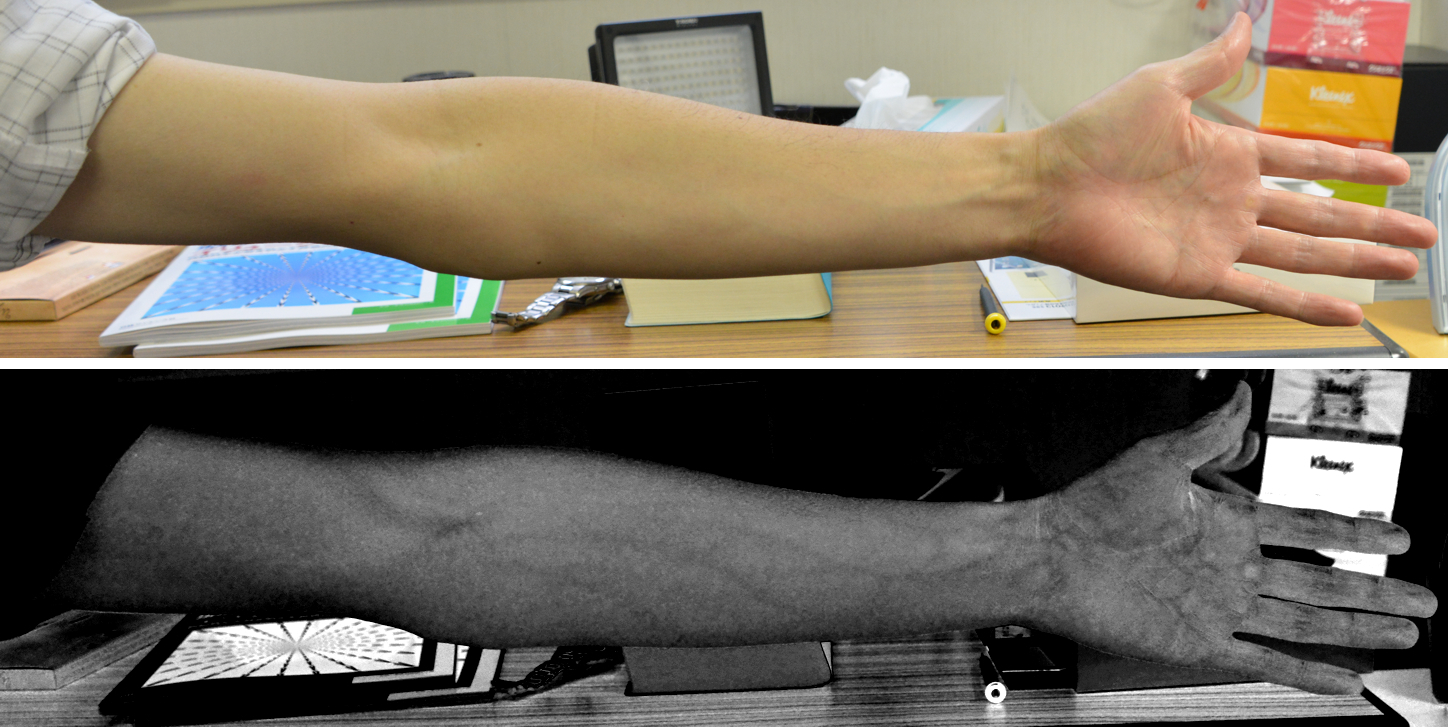 青白く撮れた写真の場合でも、この手の青く浮き出て見える静脈は物理的には青くなく、彩度の低い黄色かオレンジ色であった。