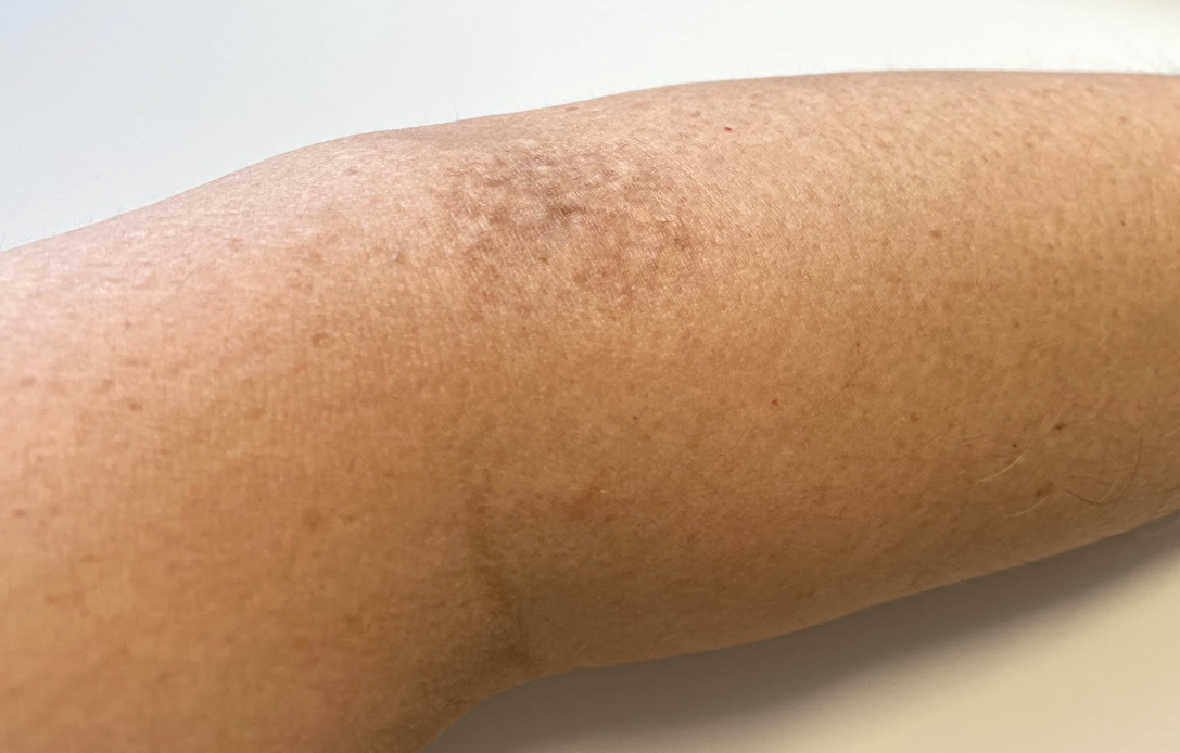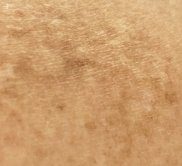 「真皮では波長の長い(赤い)光ほど透過しやすく、短い(青い)光ほど散乱されやすい性質がある。このため、皮膚の浅い部分にある毛細血管拡張や苺状血管腫は鮮やかな紅に見えるが、やや深い部にある静脈や血管腫は青っぽく見える。メラノサイト関連の母斑(あざ)でも、母斑細胞が真皮表皮境界部に存在する境界母斑では褐色調に見えるが、真皮にある青色母斑はその名のごとく青色調に見え、真皮メラノサイトによる太田母斑や蒙古斑も臨床的に青みを帯びて見える。」 (北岡注: シミュレータで作成された色パッチが示されており、「青色調」と表現しているだけであって、物理的に青色だと認識しているわけではないことが分かる)
