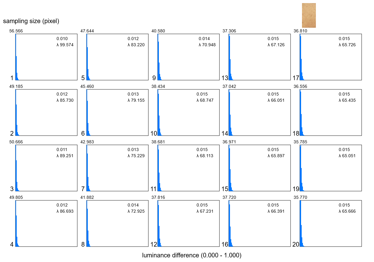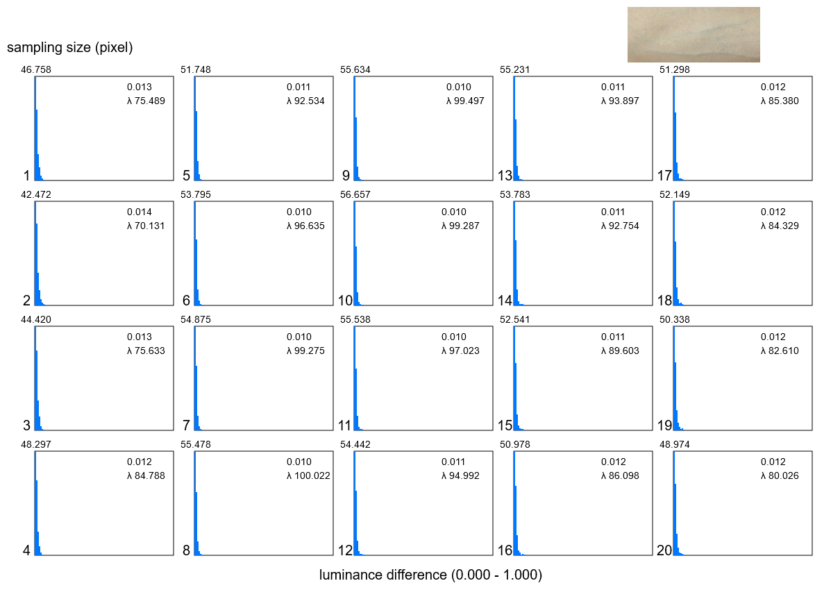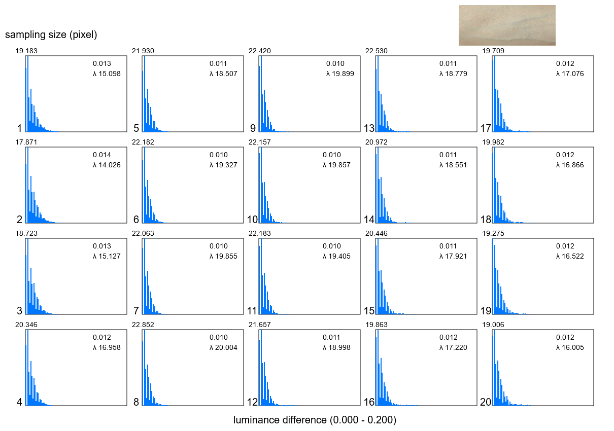 静脈は青く見えますが、写真を撮って画素を調べると、たいていは青くありません。灰色か、彩度の低い肌色(黄色からオレンジ色にかけての色相)です。この色の錯視は、記述的には「色の対比錯視」です。ただ、単純な色の対比錯視図形では、このような強い効果は得られません。自然画像は、色の強さのヒストグラムを全画素から作ると、その分布が一様に広がっていることがわかりますが、色の錯視の画像のいくつかは、ヒストグラムが偏っています。その偏りを画像処理によって均一化する(引き伸ばす)と、色の錯視の変位と同方向の色相の変化が観察されます。我々の視覚系も同様のこと(ヒストグラム均等化)を行っていると考えられます。